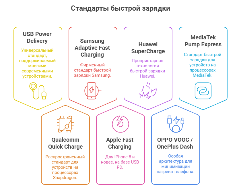 - Apple Fast Charging – для iPhone 8 и новее, работает на базе стандарта USB PD.