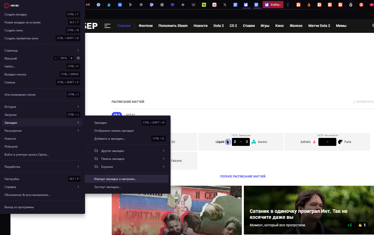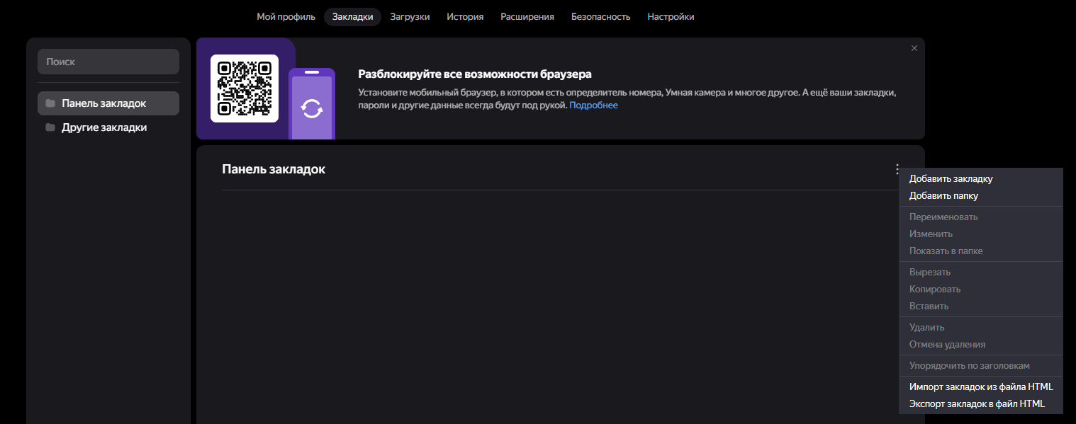 Повторите все шаги из прошлого пункта, но вместо «Экспортировать закладки» выберите «Импортировать закладки» и укажите сохраненный файл.