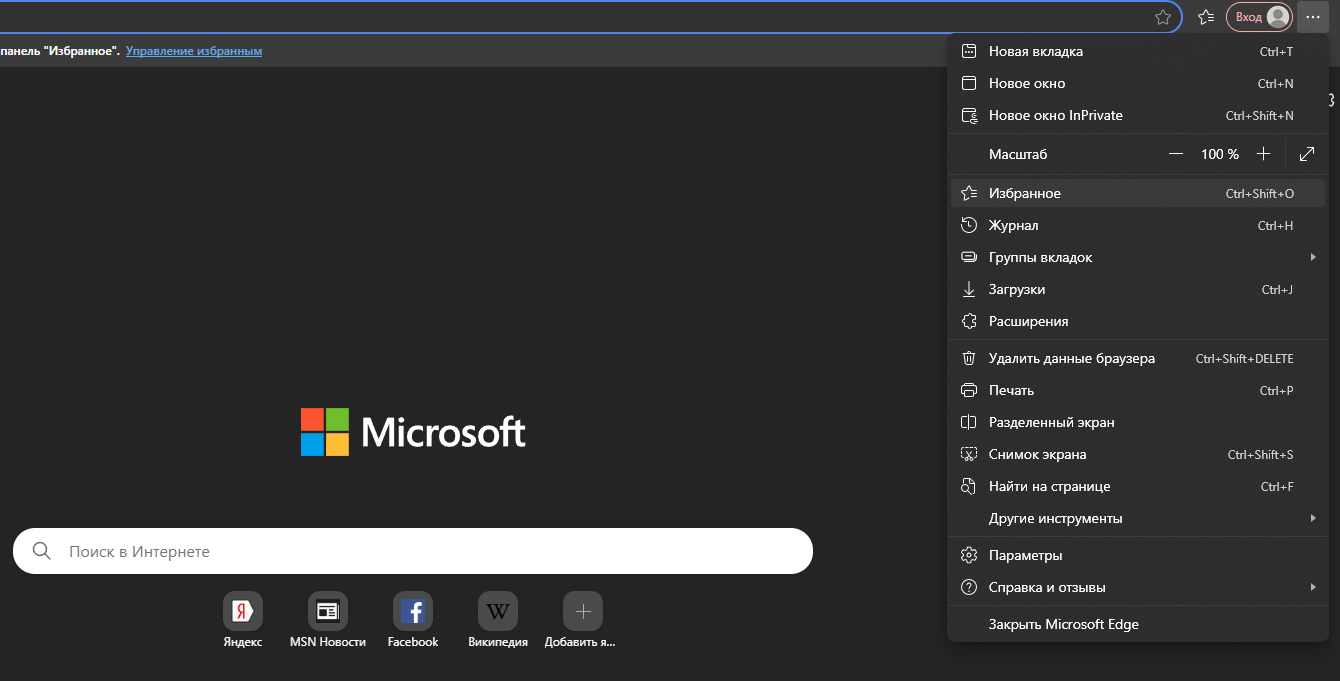 Нажмите на иконку с тремя точками в правом верхнем углу и перейдите в «Избранное» (или нажмите Ctrl + Shift + O).