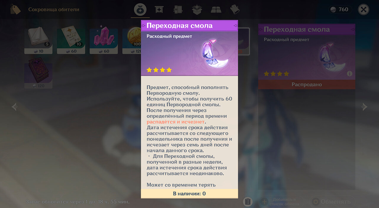 Переходную смолу можно купить в Чайнике безмятежности за 1200 единиц, а также получить за прохождение Театра «Воображариум». Всего в инвентаре может находиться не больше двух штук одновременно.