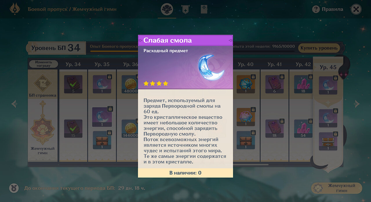 Смола восстанавливается даже если игрок закрыл игру. Одна единица смолы восстанавливается раз в 8 минут. Максимальный лимит смолы – 200 единиц и 5 густой смолы.