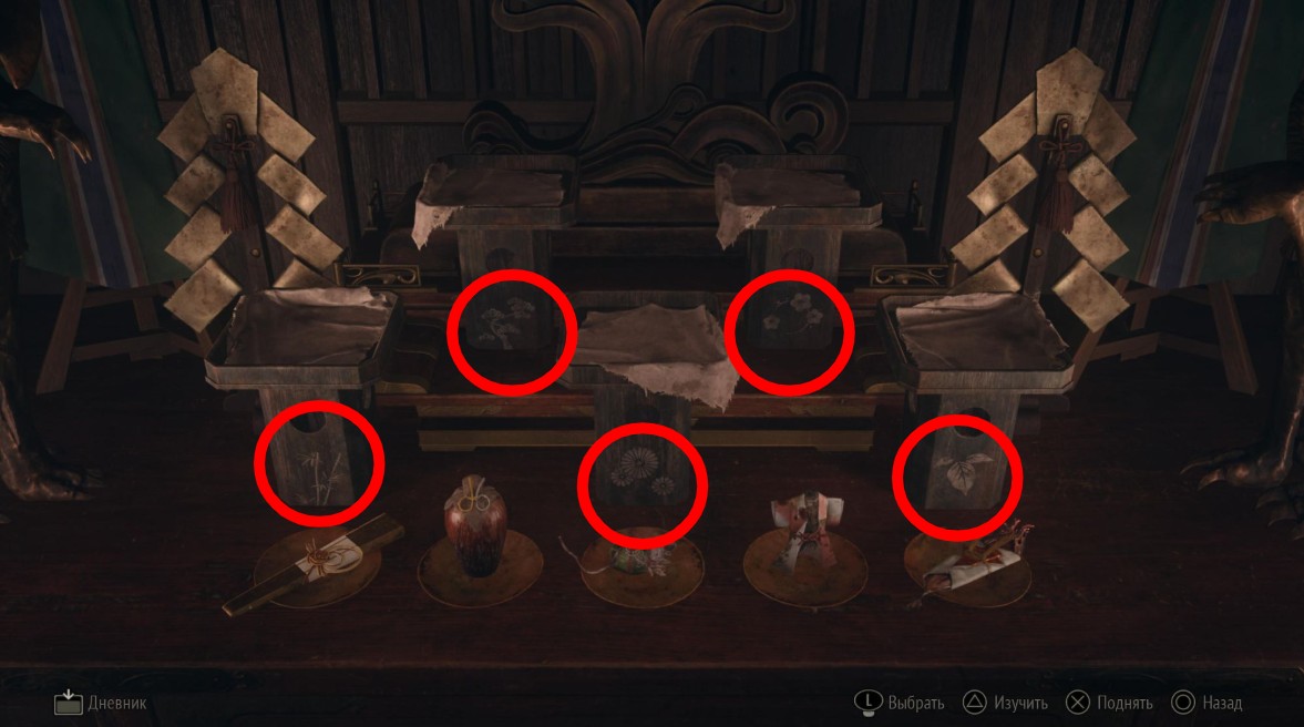 Чтобы решить загадку, необходимо сопоставить изображения на подношения с рисунками растений на постаментах. Для этого внимательно изучите каждый предмет (кнопка «треугольник» на геймпаде) и обратите внимание на детали. Вот что можно заметить: