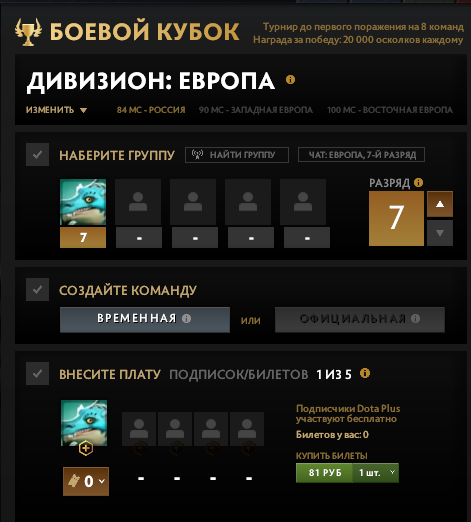 Как поучаствовать? Все очень просто. Вам нужно собрать команд из пяти человек, у каждого из которых должен быть либо Dota Plus, либо билет (стоит 81 рубль). Билеты могут быть у кого угодно из участников, главное чтобы их было не меньше, чем участников без Dota Plus.