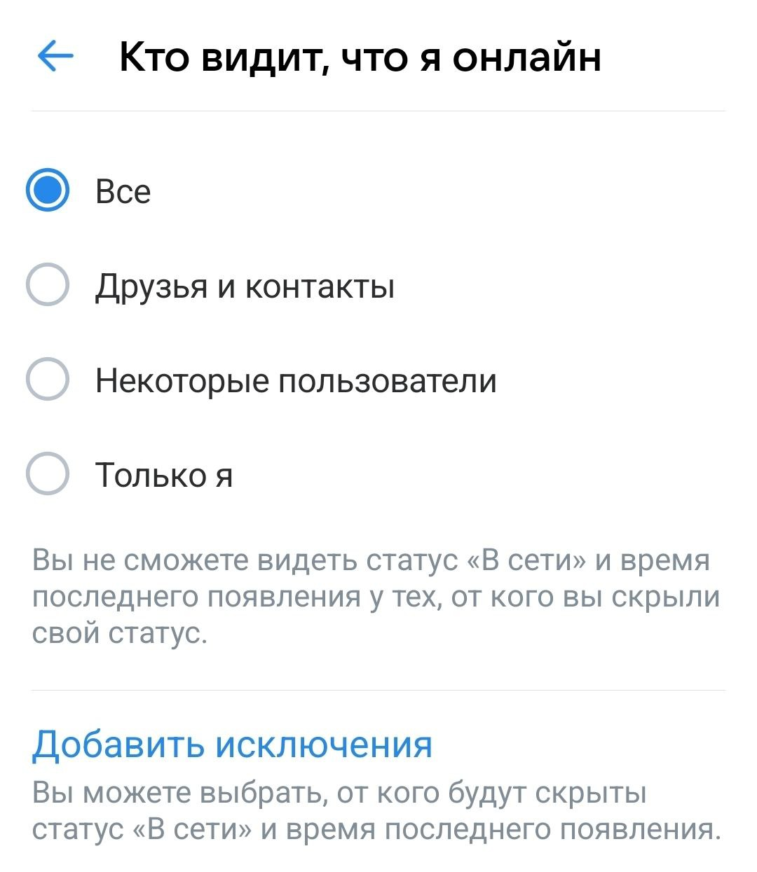 - Все – статус остается открытым, но при необходимости можно добавить исключения для отдельных людей. В таком случае вы тоже не будете видеть, когда они заходили последний раз.