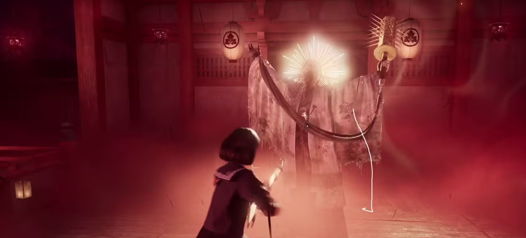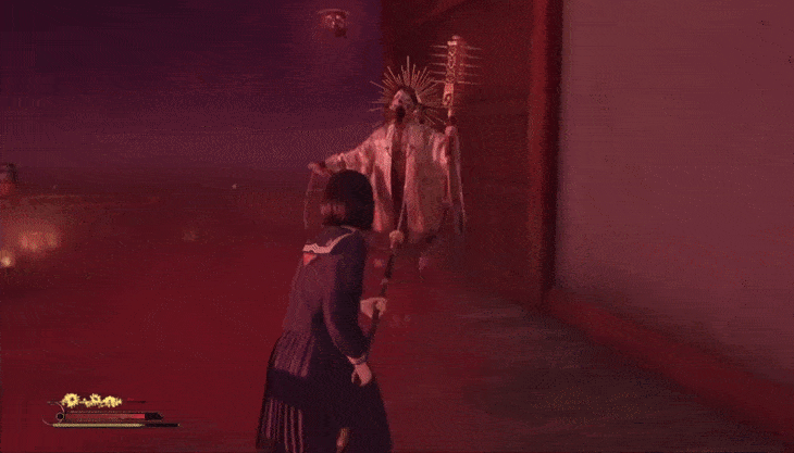 Когда Сакуко получит достаточно урона, начнется вторая фаза. Арена погрузится во тьму, а босс начнет телепортироваться по разным точкам и бить в колокол. Каждый удар будет отнимать у Хинако здравомыслие. Ваша задача – быстро добираться до Сакуко и наносить урон, чтобы прервать ее действия. Это придется повторить несколько раз.
