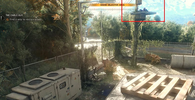Чтобы добраться до столба, воспользуйтесь паркуром – прыгните на генератор рядом с подстанцией, затем заберитесь на уличный фонарь, а оттуда перепрыгните на опору электросети. Именно на ней вы найдете кабель, соединяющий столб и подстанцию.
