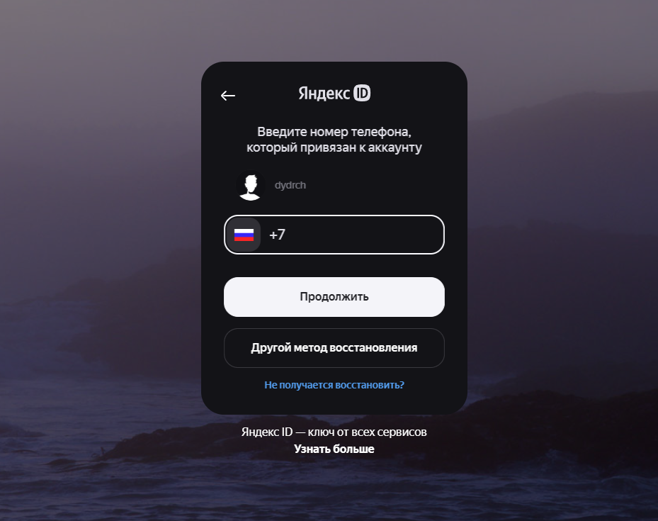 Введите номер телефона, к которому был привязан утраченный логин, и подтвердите его с помощью SMS.