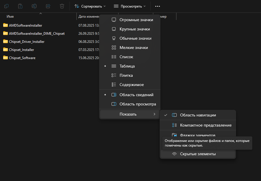 - В раскрывшемся меню найдите раздел «Показать» и поставьте галочку напротив пункта «Скрытые элементы».