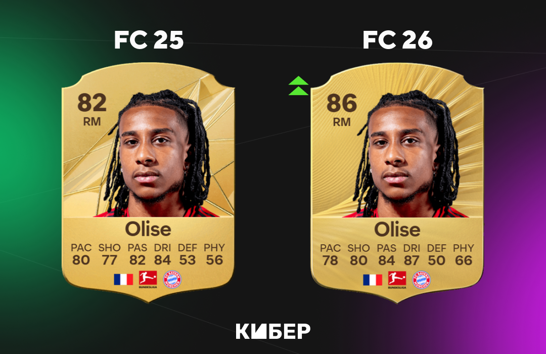 Прошлым летом Майкл Олисе уехал в Германию и покорил Бундеслигу. Француз создал эффективную связку с Харри Кейном, собрал около 40 голевых действий и закрепился в основе сборной Франции. В прошлых частях его апгрейд показался бы нормальным, но не сейчас. Разве кто-то считает Олисе слабее Сака или Хвичи?
