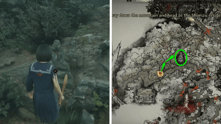 Третью статую божества можно обнаружить за школой, рядом с хижиной. Для ее активации необходимо найти сломанную японскую гэту (сандалию).