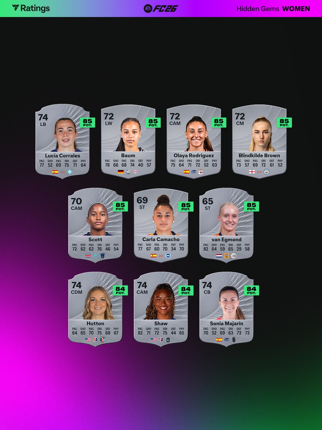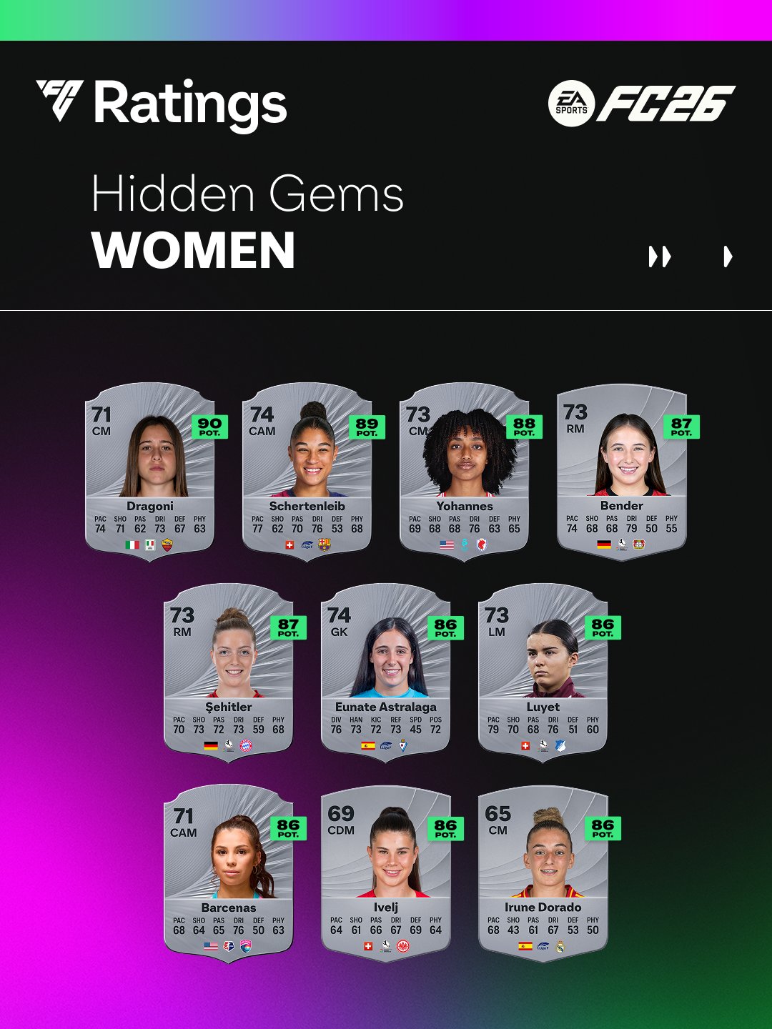 ● Самые высокие рейтинги развивают молодые футболистки Мелши Дюморне из «Лиона» (92), Линда Кайседо из «Реала», Клаудия Пина и Вики Лопес из «Барселоны» (по 91). Среди юниорок до 18 лет отметим Джулию Драгони из «Ромы» (90) и Сидни Шертенлайб из «Барсы» (89).