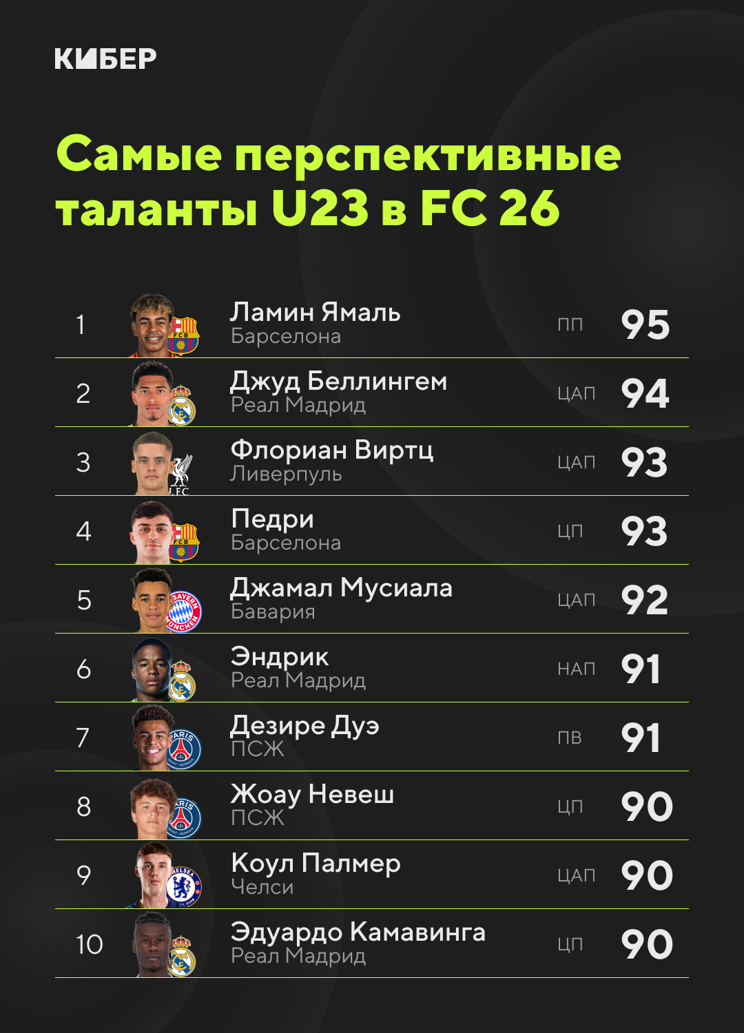 ● Ламин Ямаль получил топовый потенциал в FC 26 – 95 баллов. Джуд Беллингем из «Мадрида» по-прежнему качается до 94, а Флориан Виртц и Педри стали сильнее – по 93. В топ подтянулись молодые звезды «ПСЖ» – Дезире Дуэ (91) и Жоау Невеш (90).