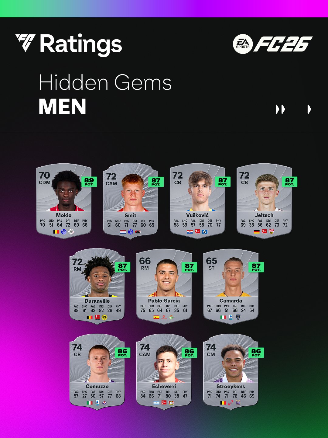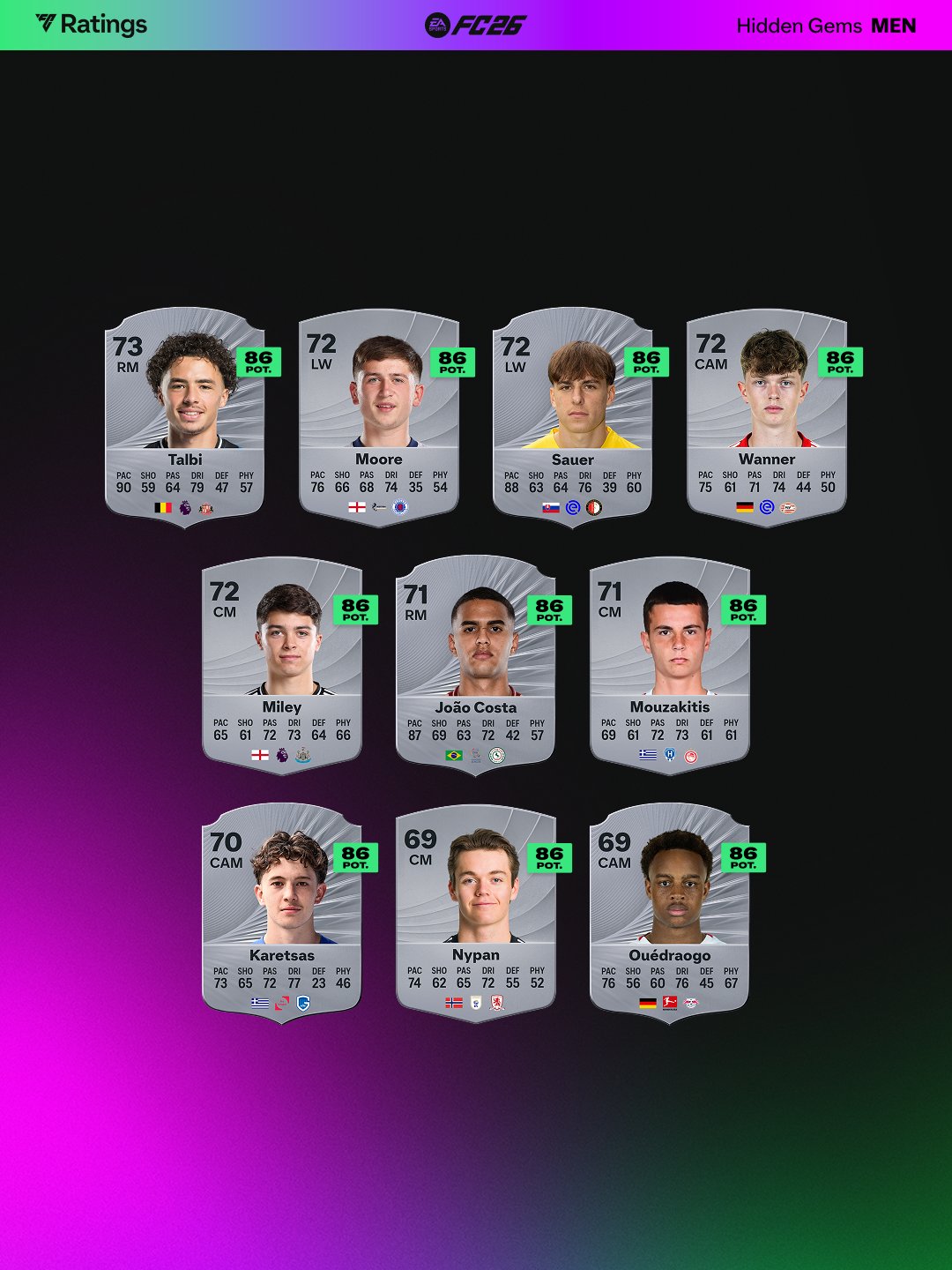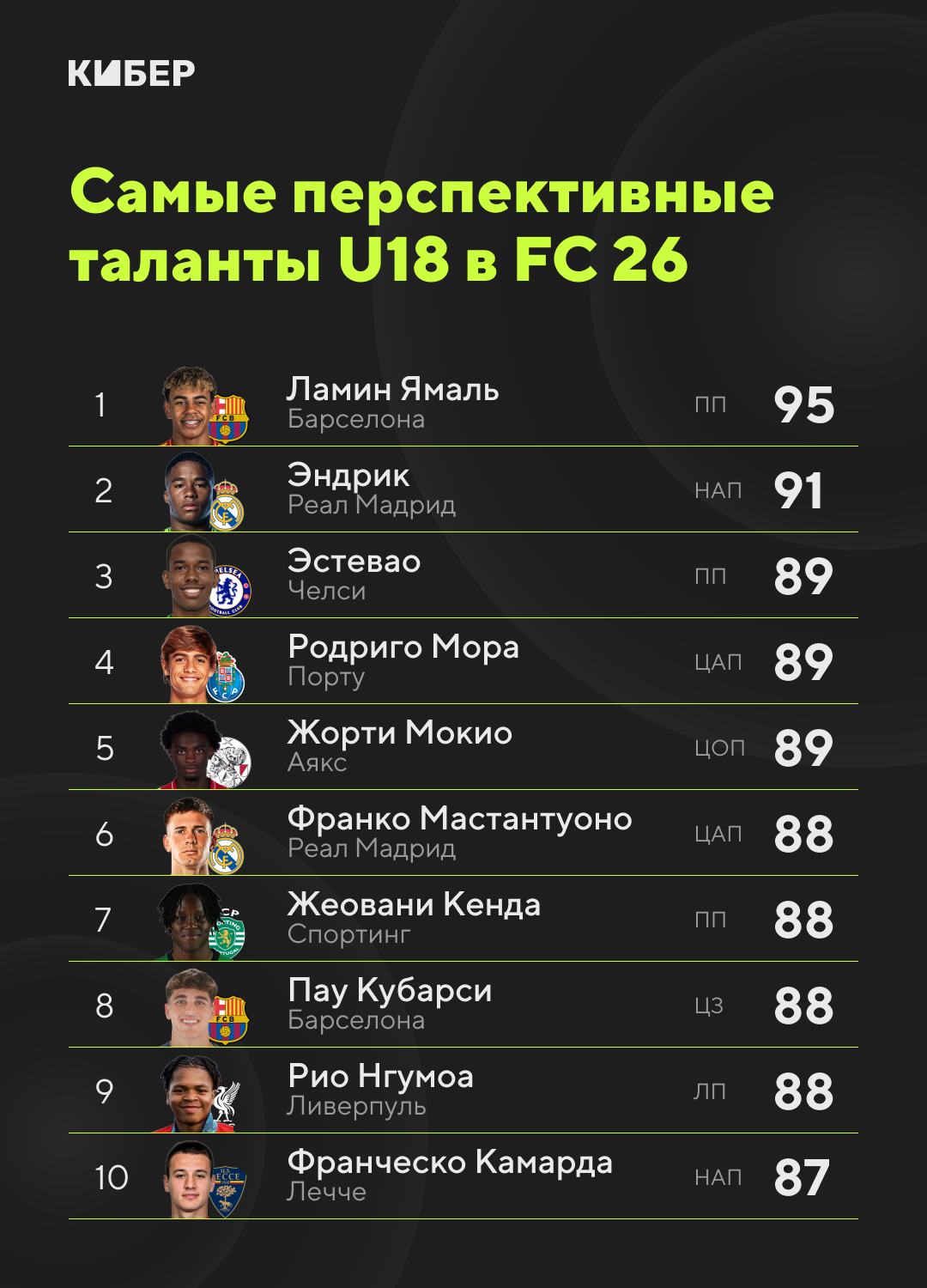 Во Франции лидируют Дезире Дуэ (91) и Эдуардо Камавинга (90), в Португалии – Жоау Невеш (90), в Нидерландах – Джоррел Хато (89), у Италии – скромный форвард «Лечче» Франческо Камарда (87). Главные бразильские таланты FC 26 – Эндрик (91) и Эстевао (89). В Аргентине верят в Нико Паса из «Комо» (89) и Франко Мастантуоно из «Мадрида» (88).