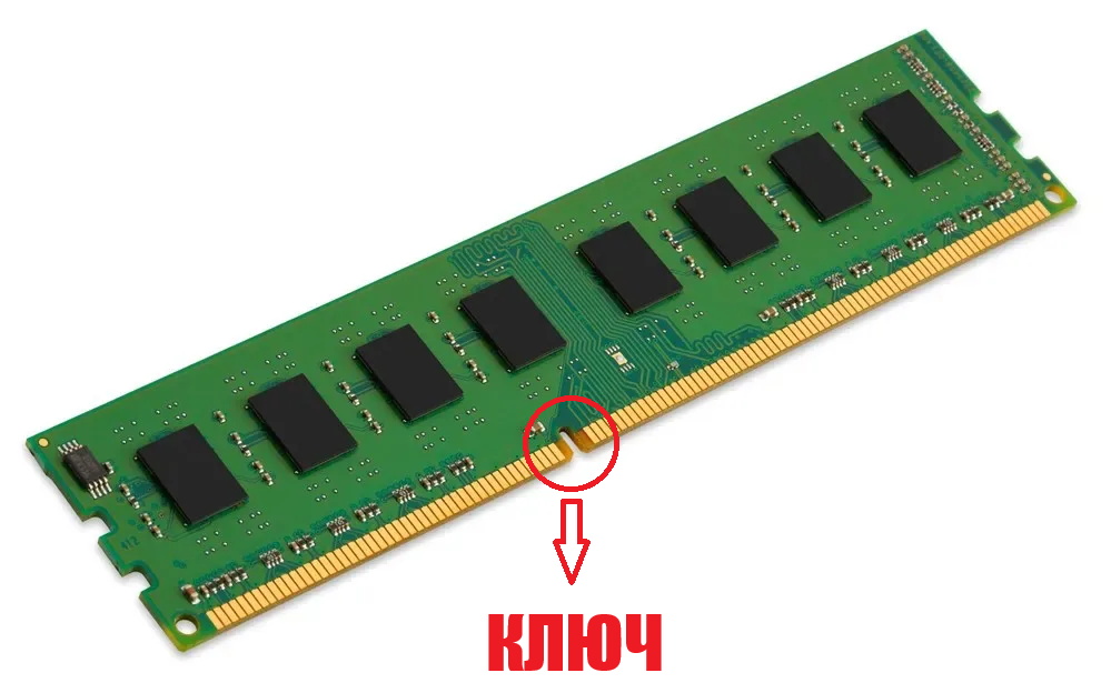 - Совместите ключ (специальную выемку на контактах планки) с выступом в слоте. Это защита от неправильной установки, поэтому вставить память не той стороной у вас не получится.