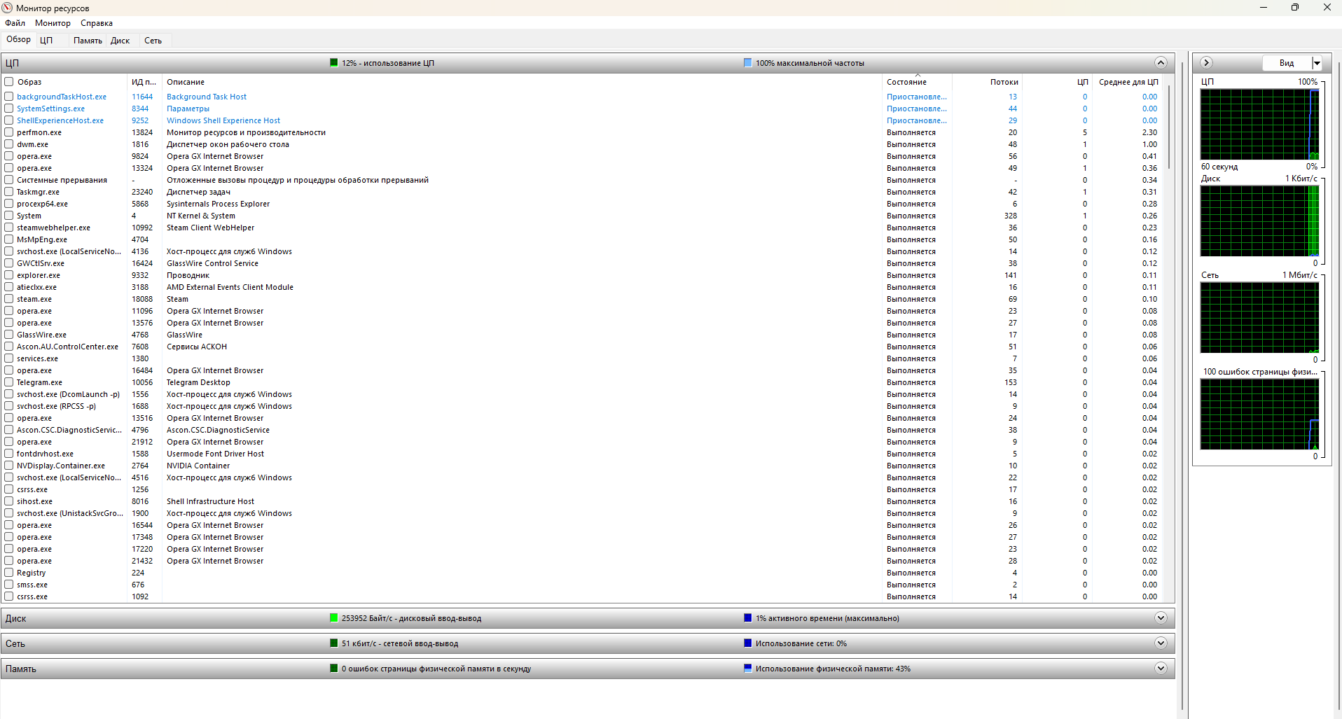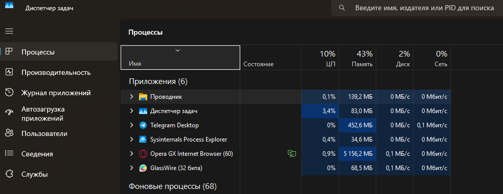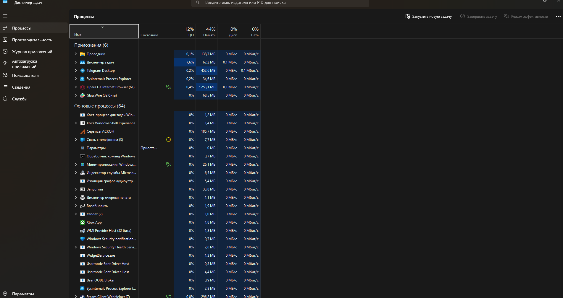 - Высокая загрузка CPU и GPU: в «Диспетчере задач» видно, что процессор и видеокарта загружены на 50% и более без видимых причин.