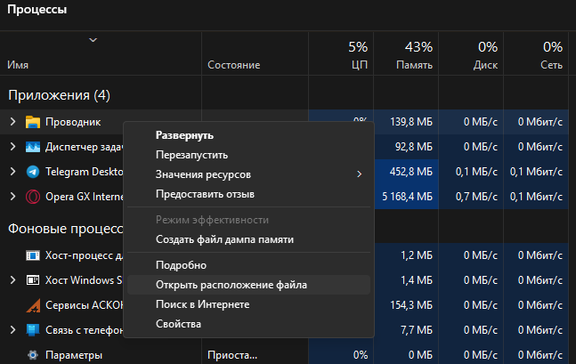 - В «Диспетчере задач» щелкните правой кнопкой по процессу и выберите «Открыть расположение файла».