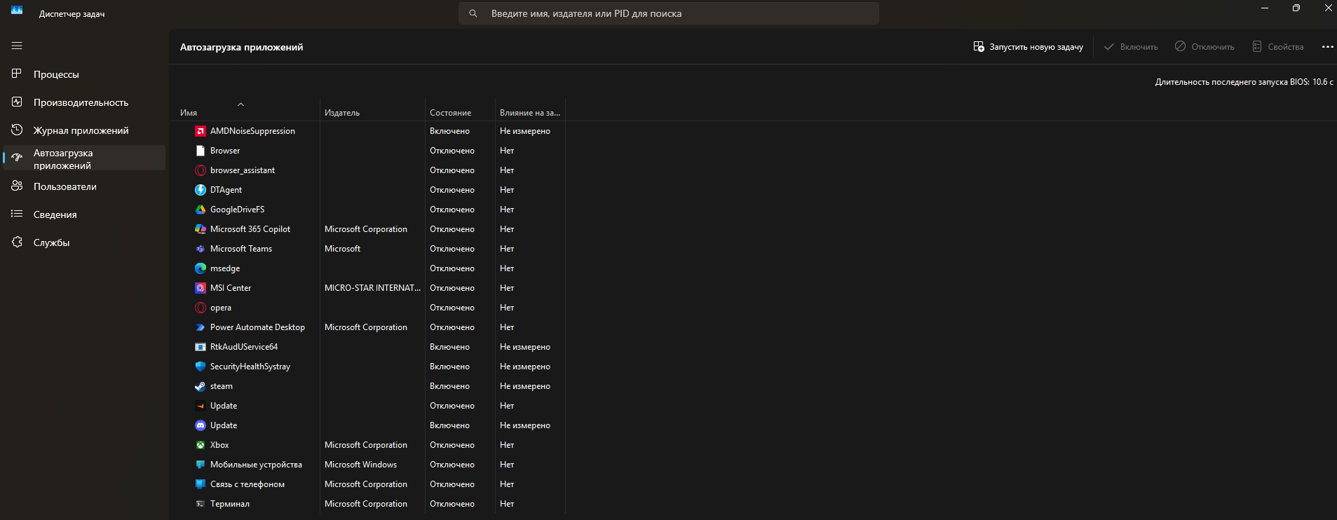 Чтобы взять это под контроль, снова зайдите в Диспетчер задач и перейдите на вкладку «Автозагрузка». Вы увидите список всех приложений, стартующих вместе с Windows. Отключите те, которые вам не нужны сразу после включения компьютера. Это не удалит программы, но предотвратит их автоматический запуск, что положительно скажется на скорости загрузки системы и количестве свободной оперативной памяти.