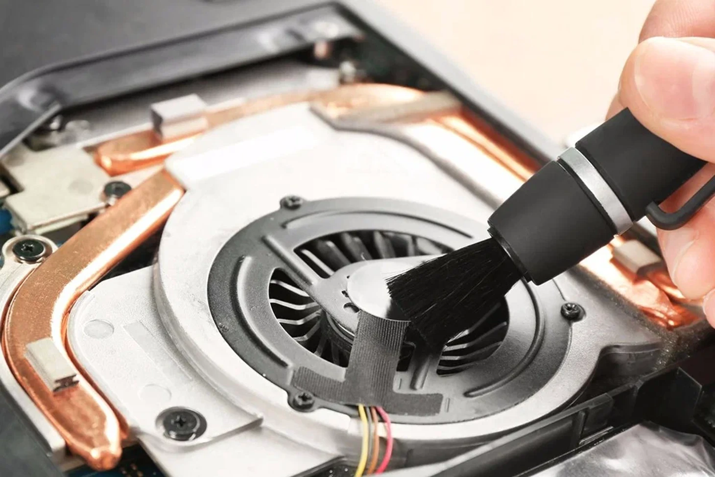 - Снимите систему охлаждения, очистите лопасти вентилятора и ребра радиатора с помощью баллончика сжатого воздуха и мягких кисточек.