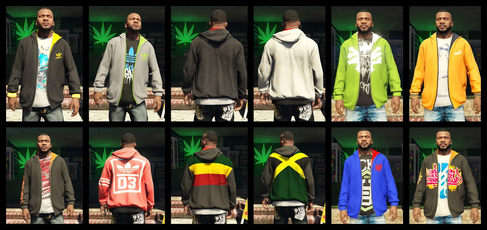 Такой мод особенно понравится тем, кто ценит разнообразие и не хочет тратить часы на подбор отдельных вещей. Здесь все сделано заранее, причем с учетом разных категорий — повседневная, пляжная, спортивная, деловая и даже эксцентричная. Благодаря этому Франклин сможет выглядеть уместно в любой ситуации, будь то вечеринка в клубе или участие в ограблении казино.