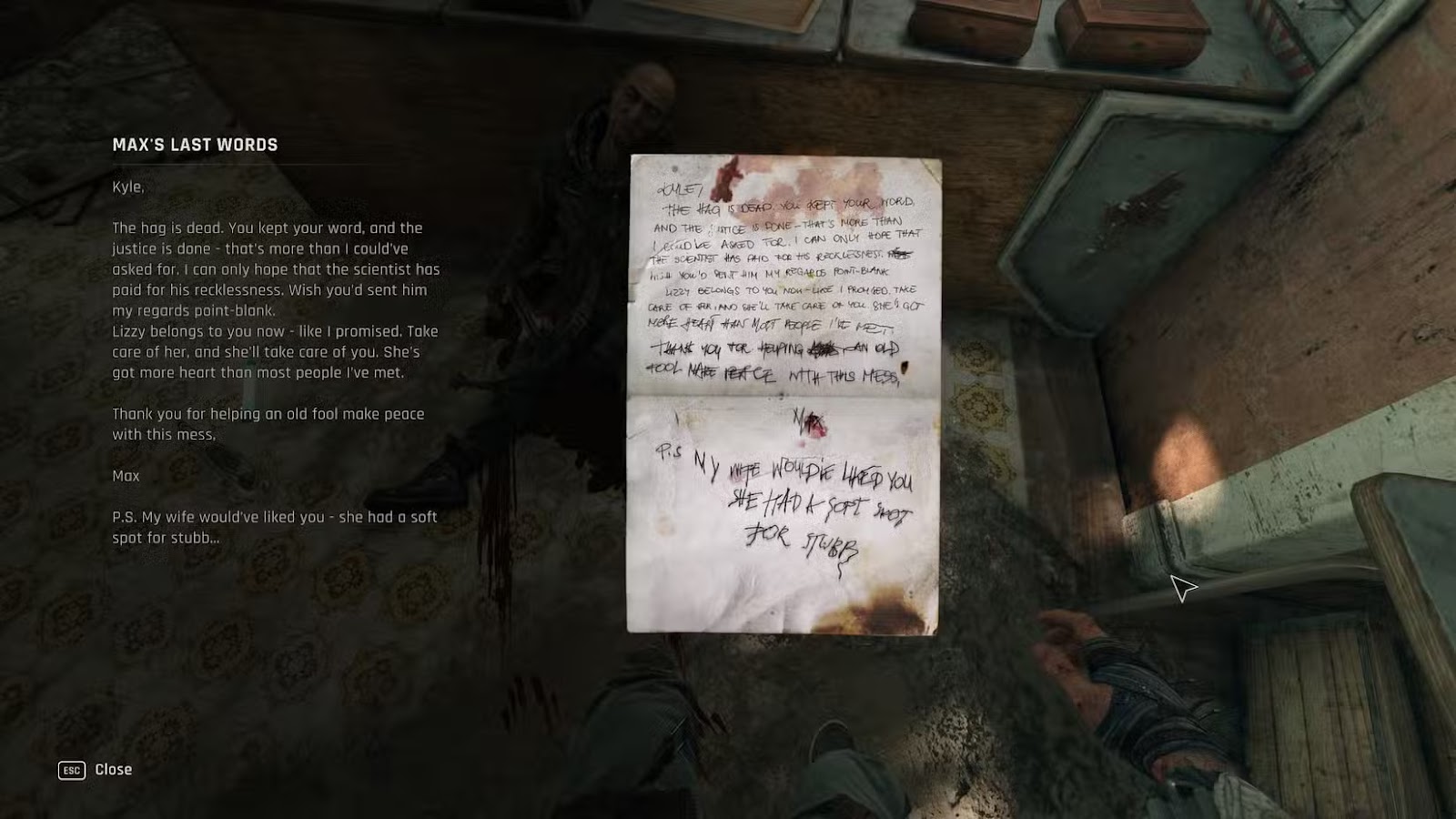 Важно: этот выбор не влияет на финальные награды квеста. Какой бы путь вы ни выбрали, вернитесь в безопасную зону «Заброшенный дом». Там вы найдете мертвого Макса и записку с его последними словами. Он благодарит Крейна за охоту на Ягу и пишет, что его жена была бы рада познакомиться с ним.