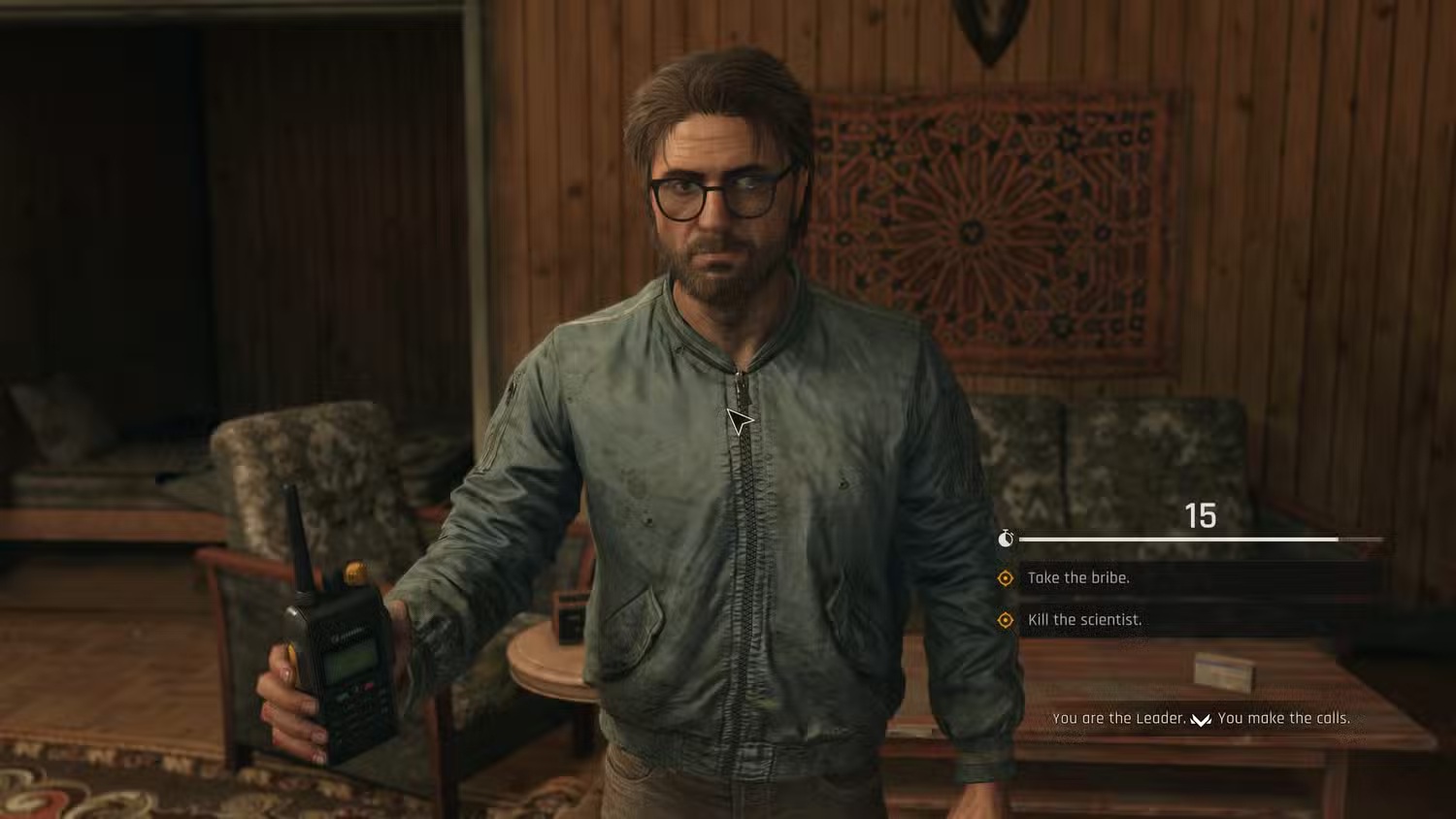 Внутри хижины вас ждут вооружённые солдаты Барона, включая снайпера на крыше. Рекомендуем сначала устранить снайпера, так как он может нанести серьезный урон. Используйте винтовку или другое мощное оружие, чтобы разобраться с врагами. После зачистки войдите в хижину через верхний балкон, чтобы встретиться с ученым. Здесь вам предстоит сделать выбор: убить его или отпустить за взятку.