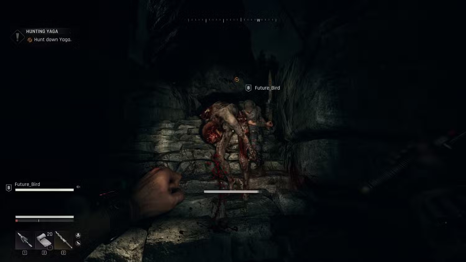 Осмотрев тело мёртвого солдата у машины, вы найдете следы Яги с помощью «Чувства выжившего». Двигайтесь осторожно, чтобы не привлечь внимание врагов. Если поблизости окажется Волатайл, спрячьтесь в высокой траве или выйдите из его зоны обнаружения.