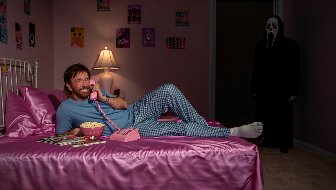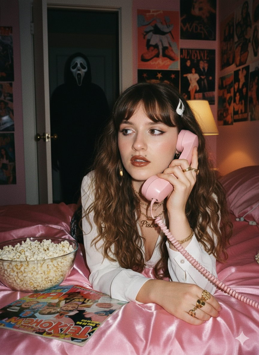 «Create a photo of me in a dreamy y2k style portrait of me laying on a shiny pink satin bedding as i hold a large pink 90s style chorded phone and in a thoughtful daydreaming pose her long hair falls freely in loose curls with white butterfly clips on each side. she wears delicate jewelry including dainty gold necklaces that says «Pisces » and accessories and gold chunky rings. the room behind her is girly and daydreamy with 90s style posters. her makeup is simple yet glamorous with brown lipgloss and brown lip liner. the photo should have a grainy 90s style to it with a light source like a lamp in a dimly lit room at night. a bowl of popcorn rests beside her near some 90s style magazines. the ghostface killer should be behind her staring at her, his body should be dimly lit, and he should be standing in the doorway of a dimly lit hallway. the background behind he should be slightly dark and ominous».
