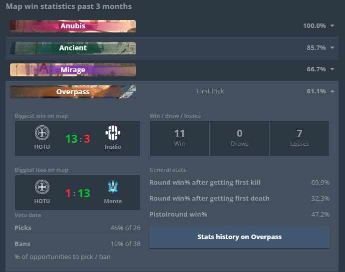 Первой картой матча стал пик HOTU – Overpass, на котором у монголов 100% винрейт. Но выборка этого винрейта – всего 3 карты, в то время как HOTU сыграли 17 Overpass за последние 3 месяца. Наигранность, тимплей и подготовка помогли якутской организации забрать свой пик.