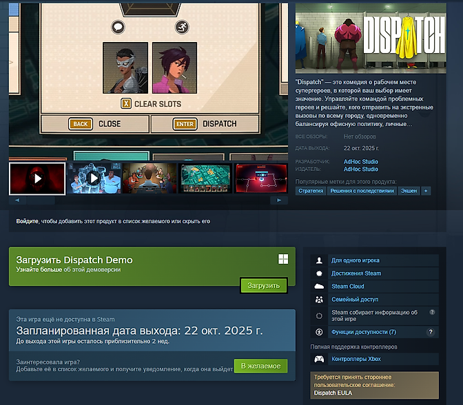 Сыграть в Dispatch можно на ПК и на PlayStation 5. Пока нет информации о выходе игры на других платформах. Базовая версия игры оценивается в $30, за $40 можно купить Deluxe-издание. Дополнительно игроки получат четыре цифровых комикса и артбук.