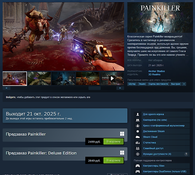 Для ПК уже открыт предзаказ. Игру можно купить за 2499 рублей, а за 2849 доступен Painkiller: Deluxe Edition. За раннюю покупку вручат набор обликов «Железный крестовый поход», а Deluxe-издание включает еще и сезонный пропуск.