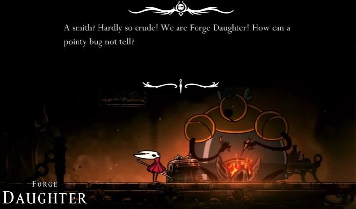 - Добираемся до дочери Кузнеца после победы над волнами противников на небольшой арене после спуска на лифте. Не бойтесь мест, где лава. Можно спокойно их проходить прыжками. Если проблемы с лавой, то покупаем у нее Магмовый Колокол за 110 бусин для огненного сопротивления