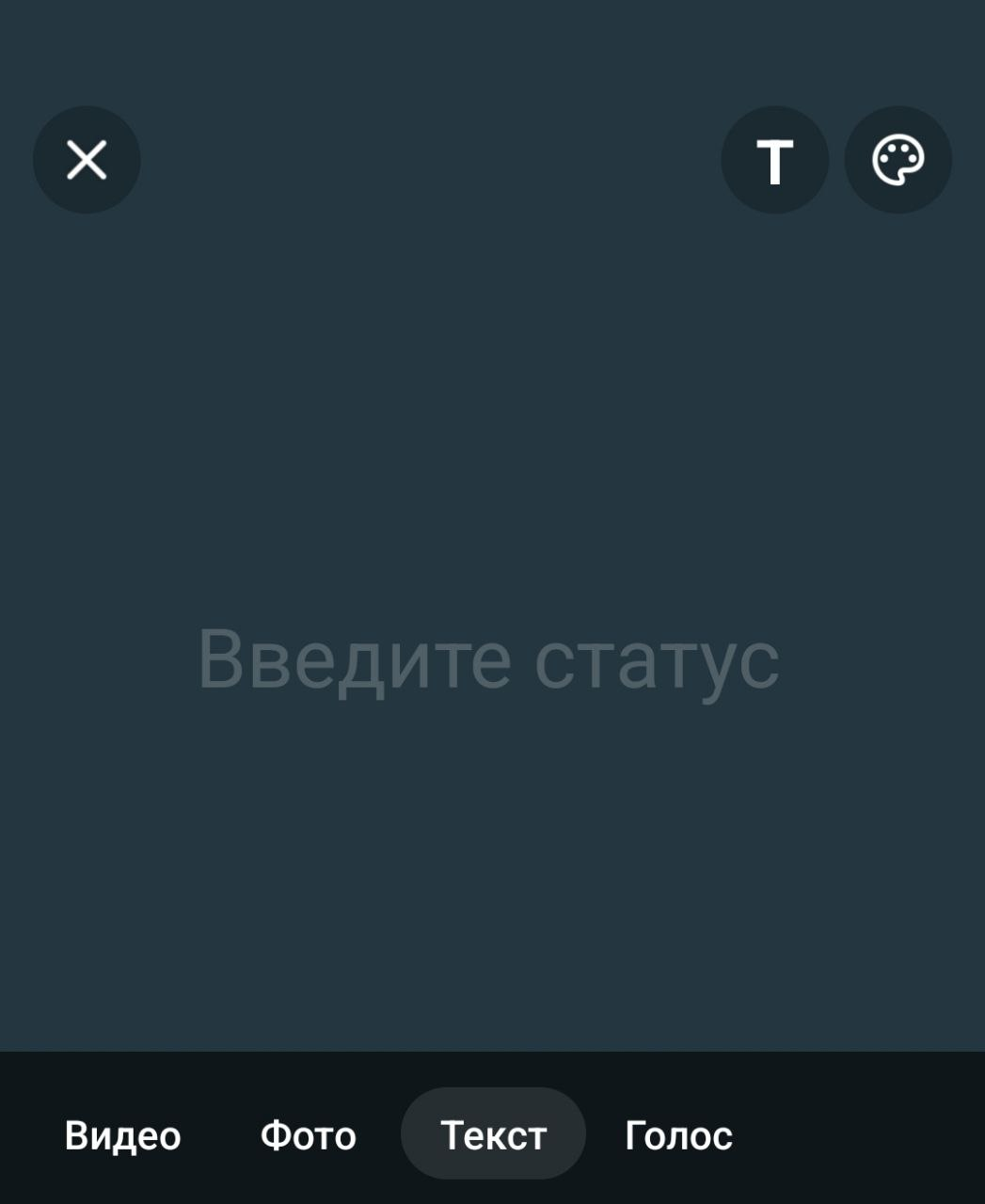 В верхней части экрана вы увидите кнопку «Добавить статус». Нажмите на нее – откроется меню выбора формата.