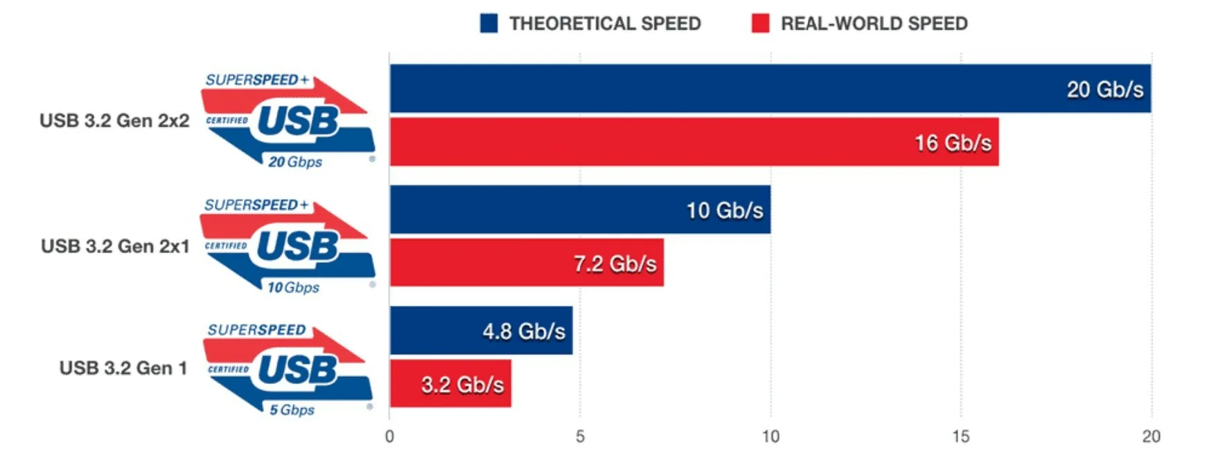 - А новый стандарт на 20 Гбит/с начал использовать 2 потока USB 3.1 Gen 2, поэтому получил имя USB 3.2 Gen 2x2 (маркировка SuperSpeed++).