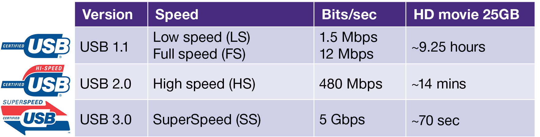 Этот стандарт уже староват, но все еще используется для подключения малотребовательной периферии: клавиатур, мышек, наушников и некоторых других устройств, где высокая скорость не нужна. Скорость этой версии – до 480 Мбит/с.