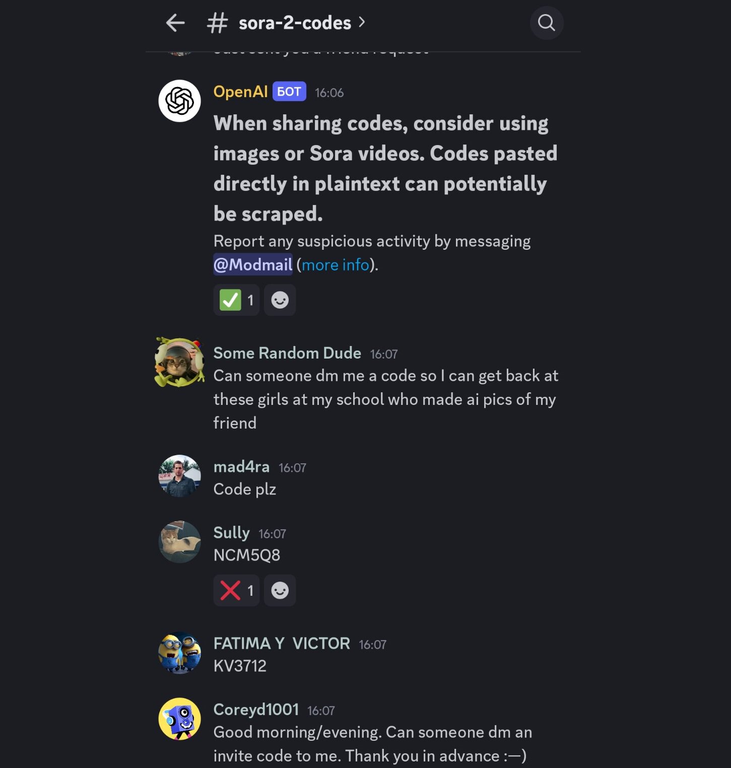 • Активные пользователи соцсетей тоже публикуют пригласительные коды. Следите, например, за постами в сообществах на Reddit или в том же дискорд-канале OpenAI в разделе Sora 2 Codes. Также поищите обсуждения в X по запросу «Sora 2 invite» и «Sora 2 code».