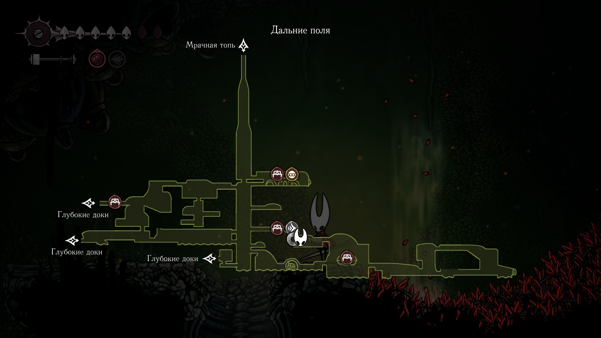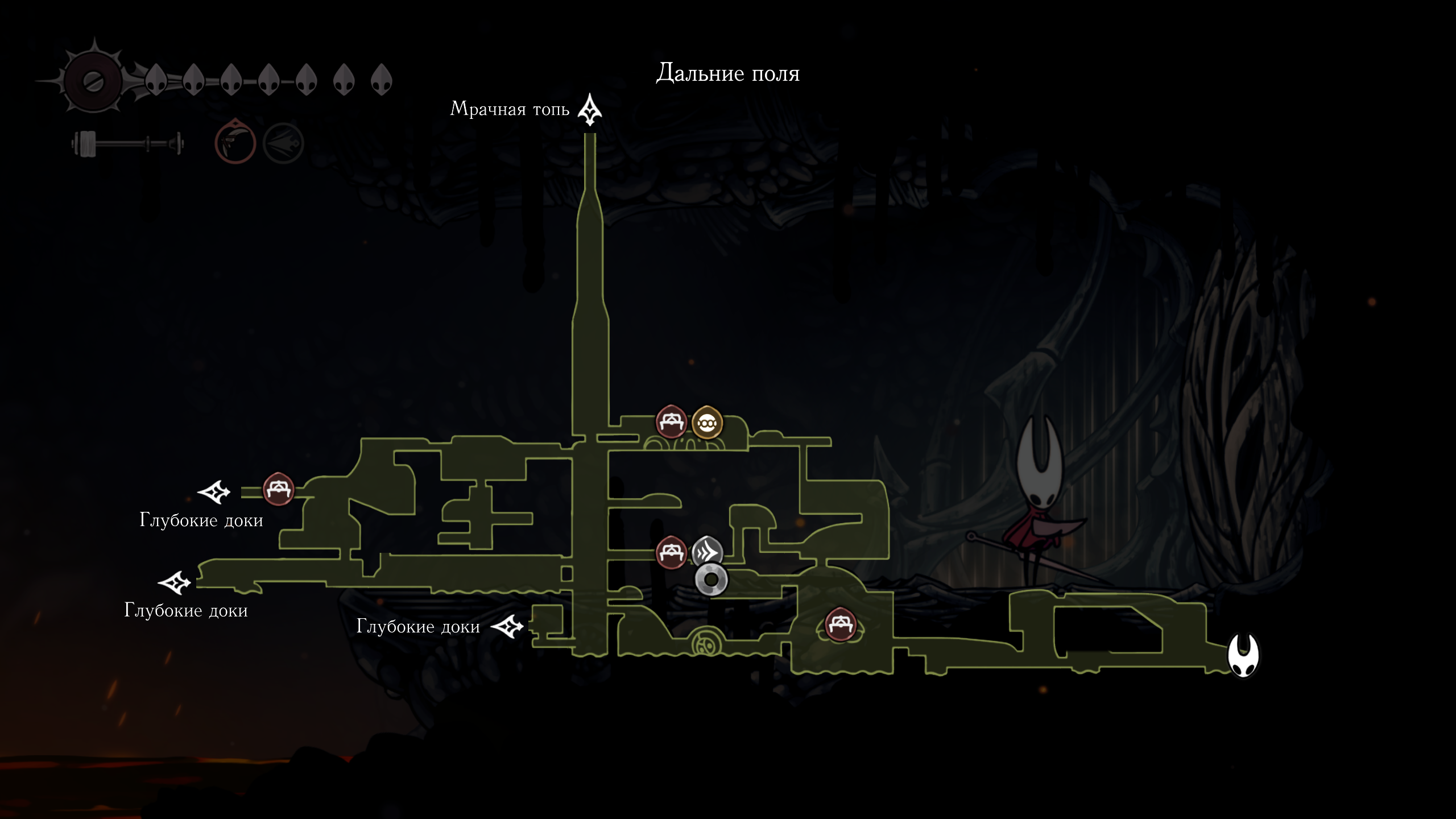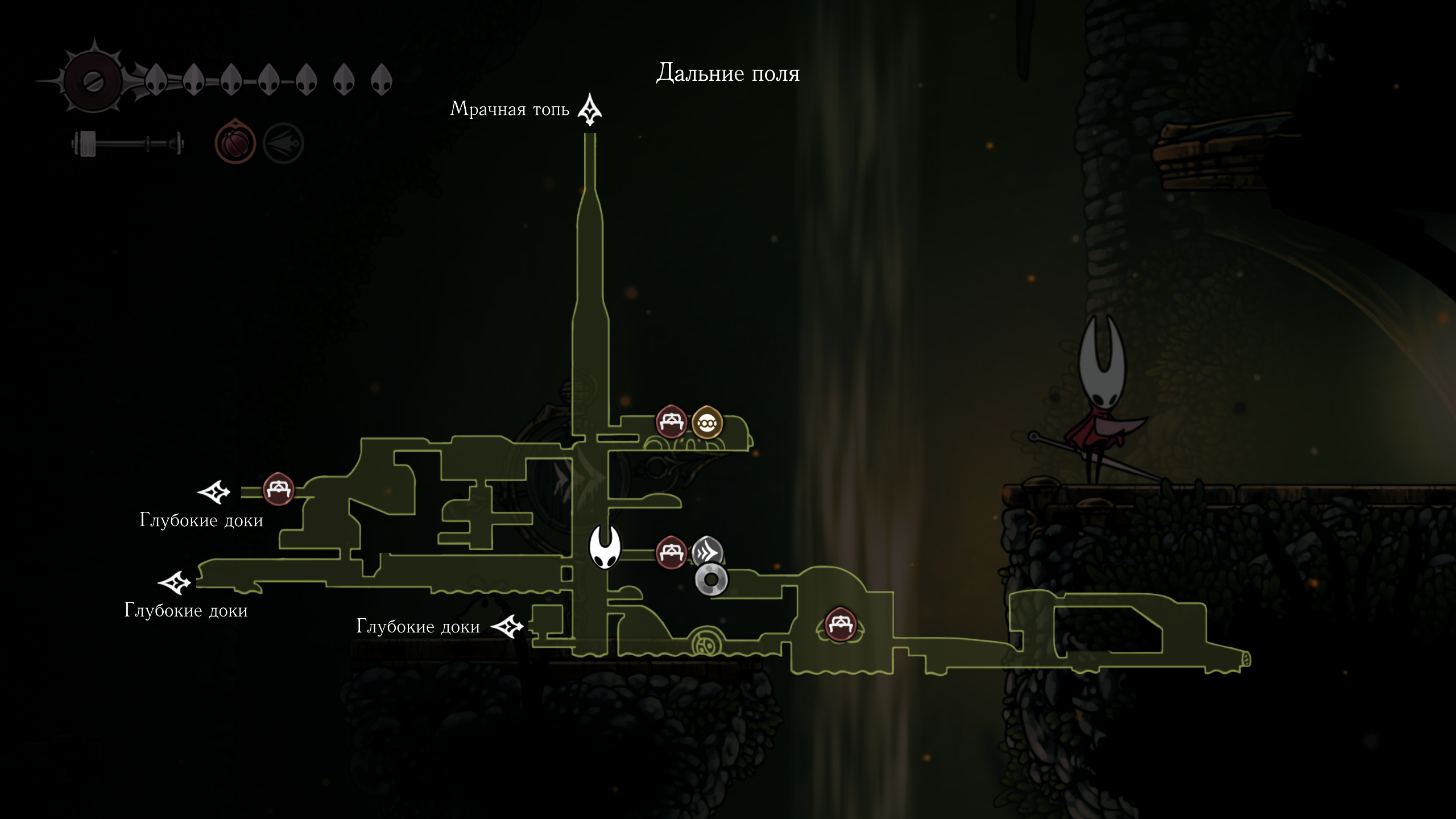 Из Дальних полей можно попасть в Плиту – местную тюрьму, если попасться особому жуку-тюремщику. Он сидит в Глубоких доках, прямо над западной скамейкой в Дальних полях. Добраться до него получится только с навыком Цепкий захват (прыжок по стенам).