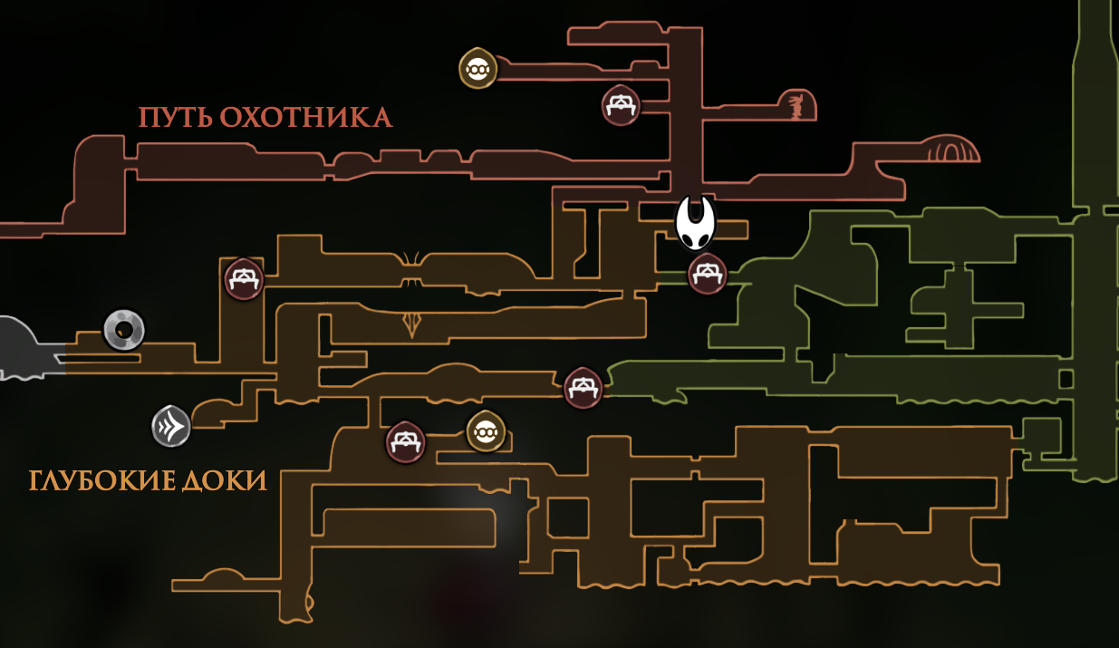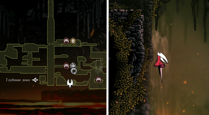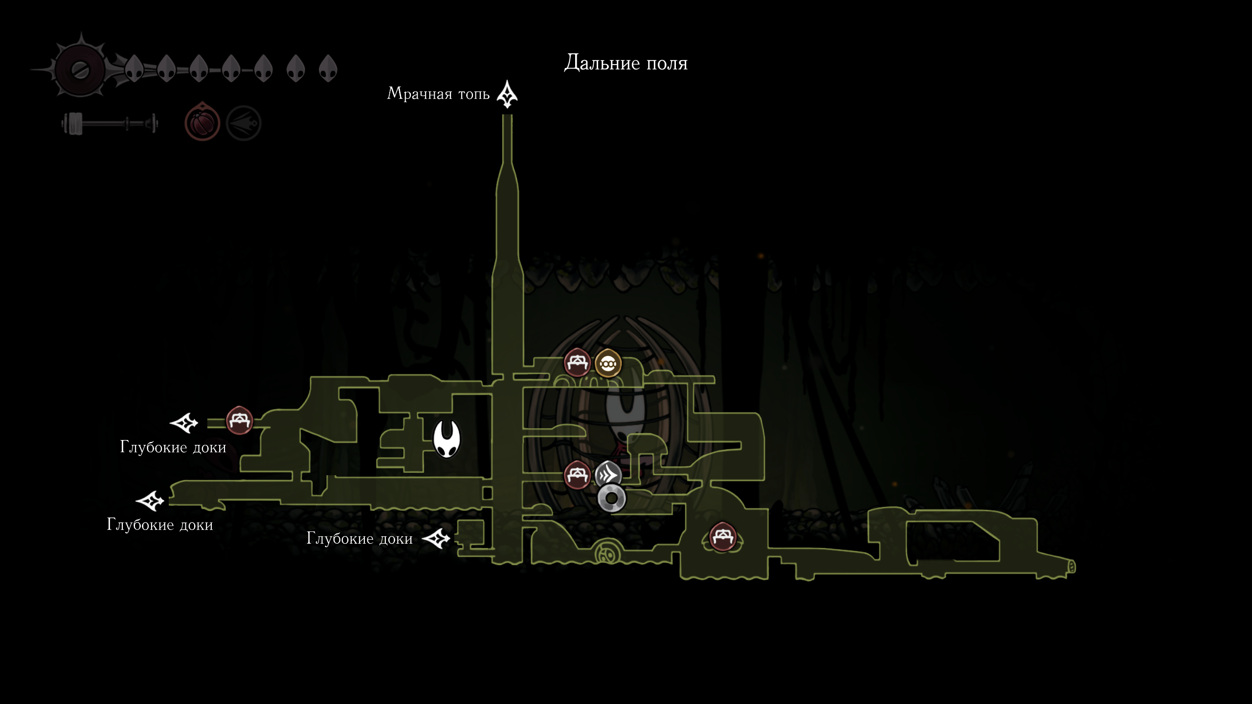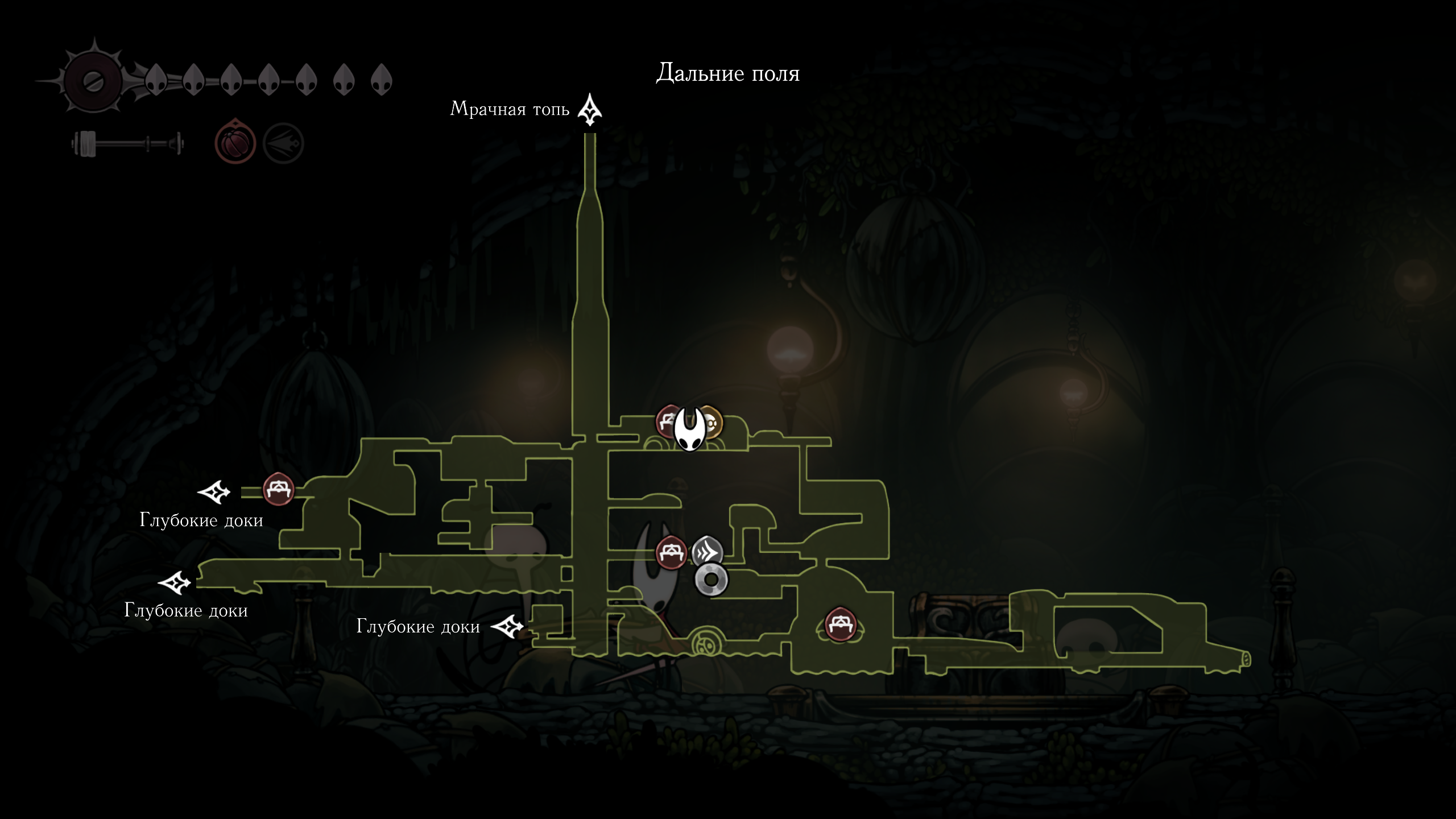 Из Дальних полей можно попасть в Плиту – местную тюрьму, если попасться особому жуку-тюремщику. Он сидит в Глубоких доках, прямо над западной скамейкой в Дальних полях. Добраться до него получится только с навыком Цепкий захват (прыжок по стенам).