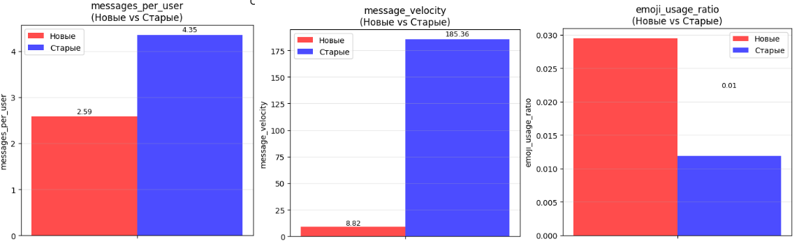 Давайте сравним удельные показатели, отражающие поведенческие паттерны «накрученных» пользователей с типичными у Никса. «Накрученных» далее называем «новыми» зрителями, а те, что были у Никса до этого стрима, – «старыми».