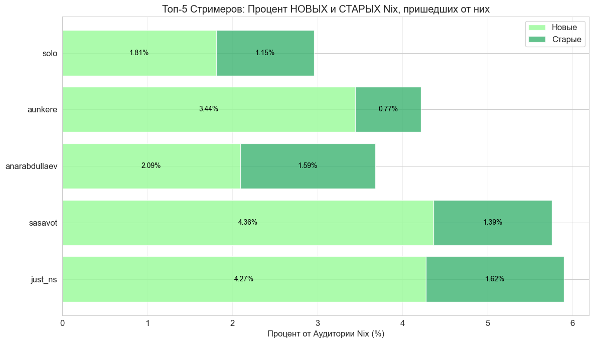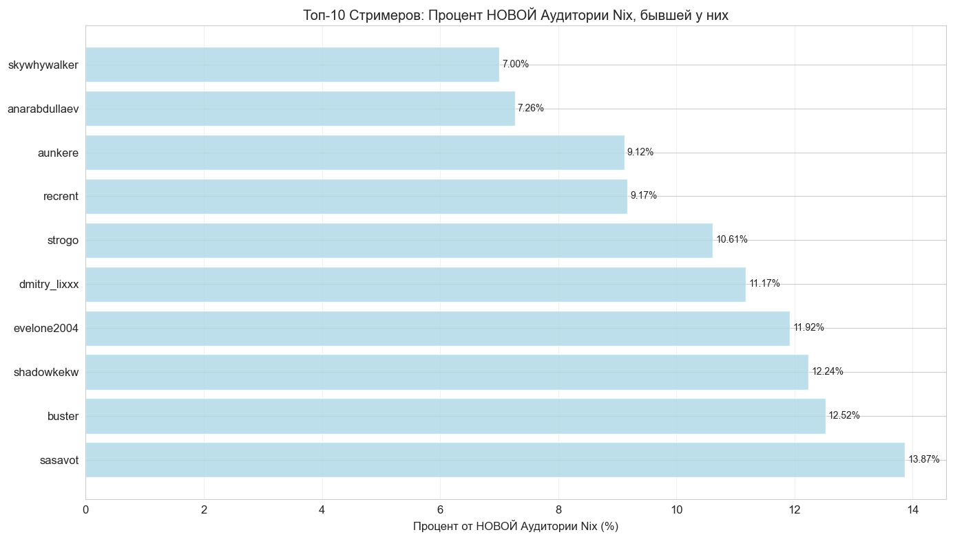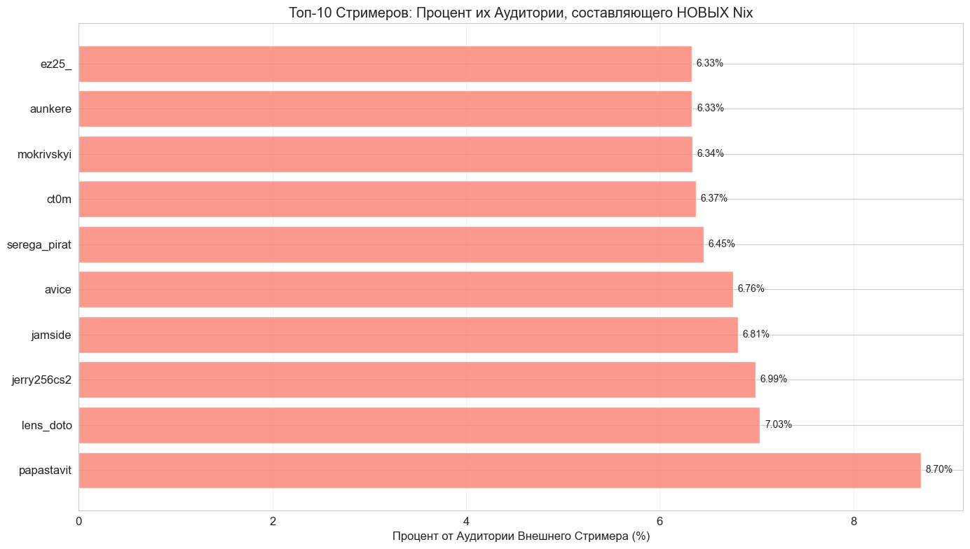 Ну и напоследок – самое интересное. У нас есть возможность проанализировать источники аудитории, которые перешли на канал Никса. То есть сначала эти чаттерсы присутствовали в чате у одного стримера, а потом через время пришли на канал Никса. Этот процент от общего количества чаттерсов, а не текущего онлайна. И важно, что учитываются только первые переходы (т.е. даже если они ходили туда-сюда между каналами, учитывается только первый переход).