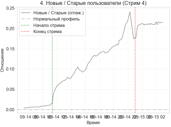 Получается, что около четверти пользователей (в пике) на трансляции ранее не заходили на канал на аналогичный ивент. Эту ситуацию (в случае, если мы допускаем накрутку) можно трактовать двумя способами.