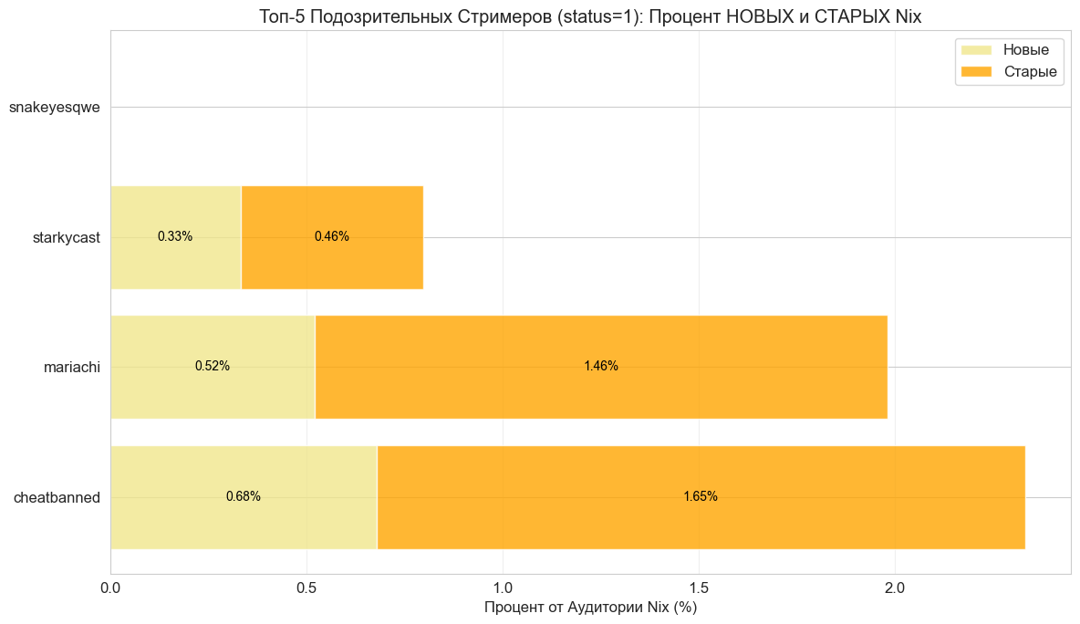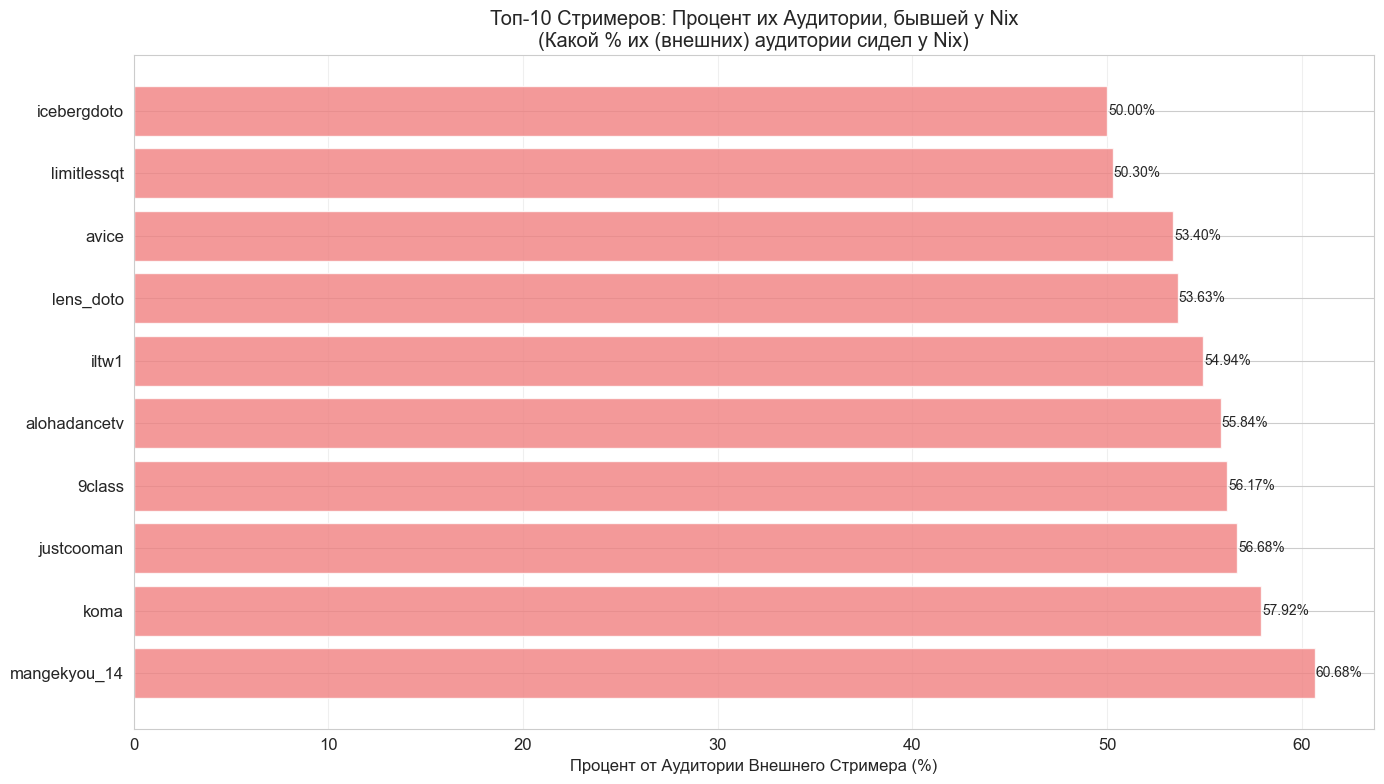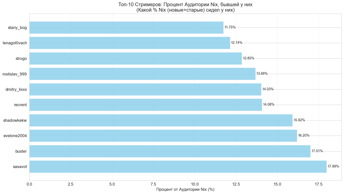 Давайте проверим, какие еще стримеры пользуются тем же сервисом накрутки, у кого еще можно наблюдать ту же аудиторию, и составим топ по проценту зрителей Никса в составе общей аудитории других стримеров.