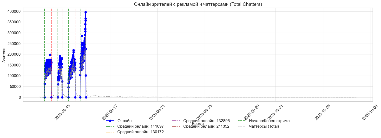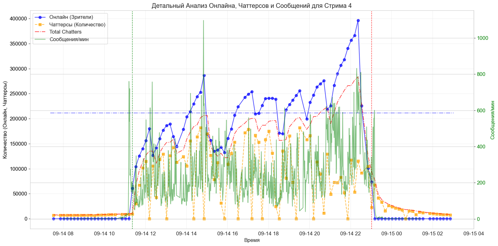 Для обнаружения наиболее явных аномалий можно обратиться к подробному графику пикового стрима. На нем отразим процент зарегистрированных пользователей, частоту отправки сообщений и другие данные. Ниже на графике вы можете видеть характеристики исходных данных для анализа – количество сообщений, чаттерсов и онлайн. Для получения данных использовались Twitch API, из которых можно узнать: