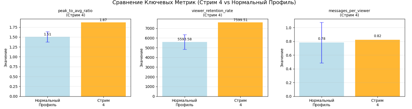 Вполне возможно, что мы можем выбрать некие удельные показатели для сравнения с другими стримами (например, разделить показатель среднего онлайна к пиковому). Сами по себе эти показатели могут ничего не означать, однако создать общую атмосферу аномальности и дать подсказку, куда рыть, – вполне.