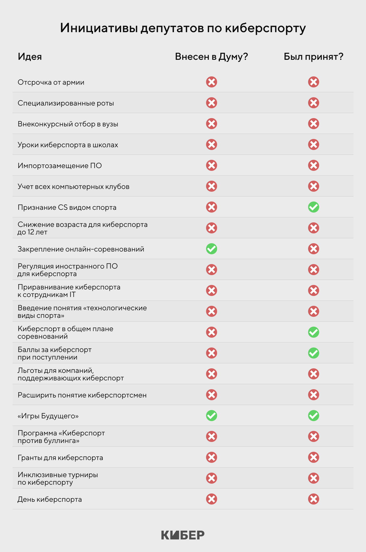 В ГД же вносился законопроект о закреплении статуса онлайн-соревнований. Большая часть игр в киберспорте проходит именно в интернете. На аренах проводятся лишь финальные дни крупных турниров. Поэтому предлагалось приравнять онлайн-соревнования с теми, что проходят оффлайн, в том числе и в других видах спорта.