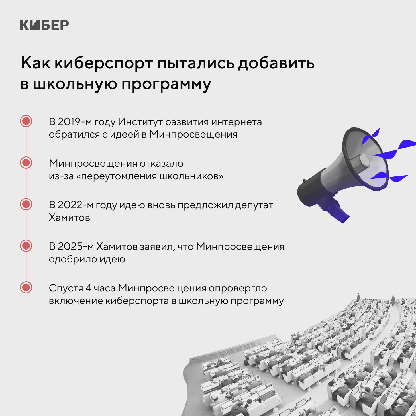 Кроме высшего образования, у чиновников были идеи и для школ. В 2025 году они предлагали запустить программу «Киберспорт против буллинга» и утверждали, что уроки по киберспорту появятся в учебных учреждениях.