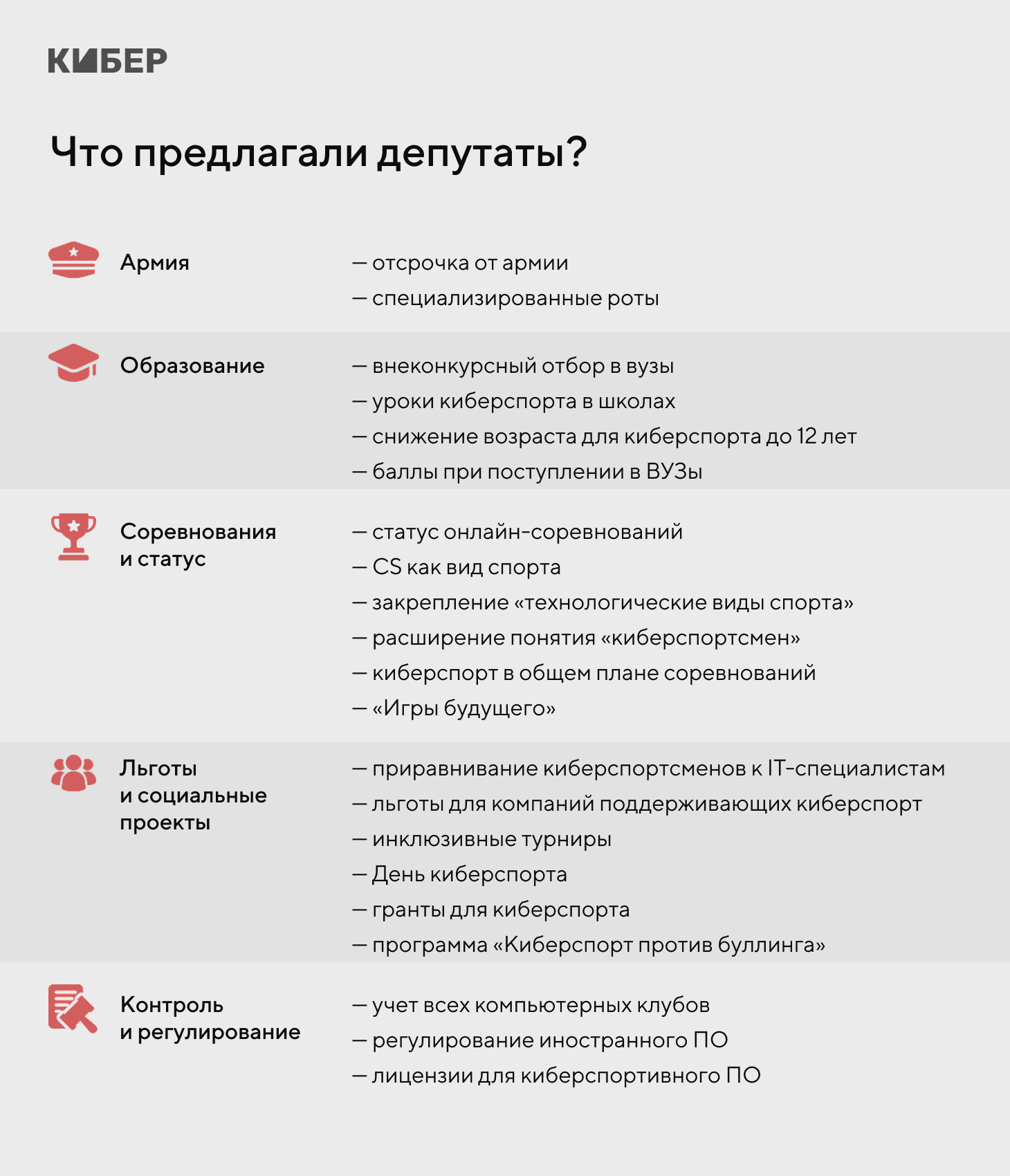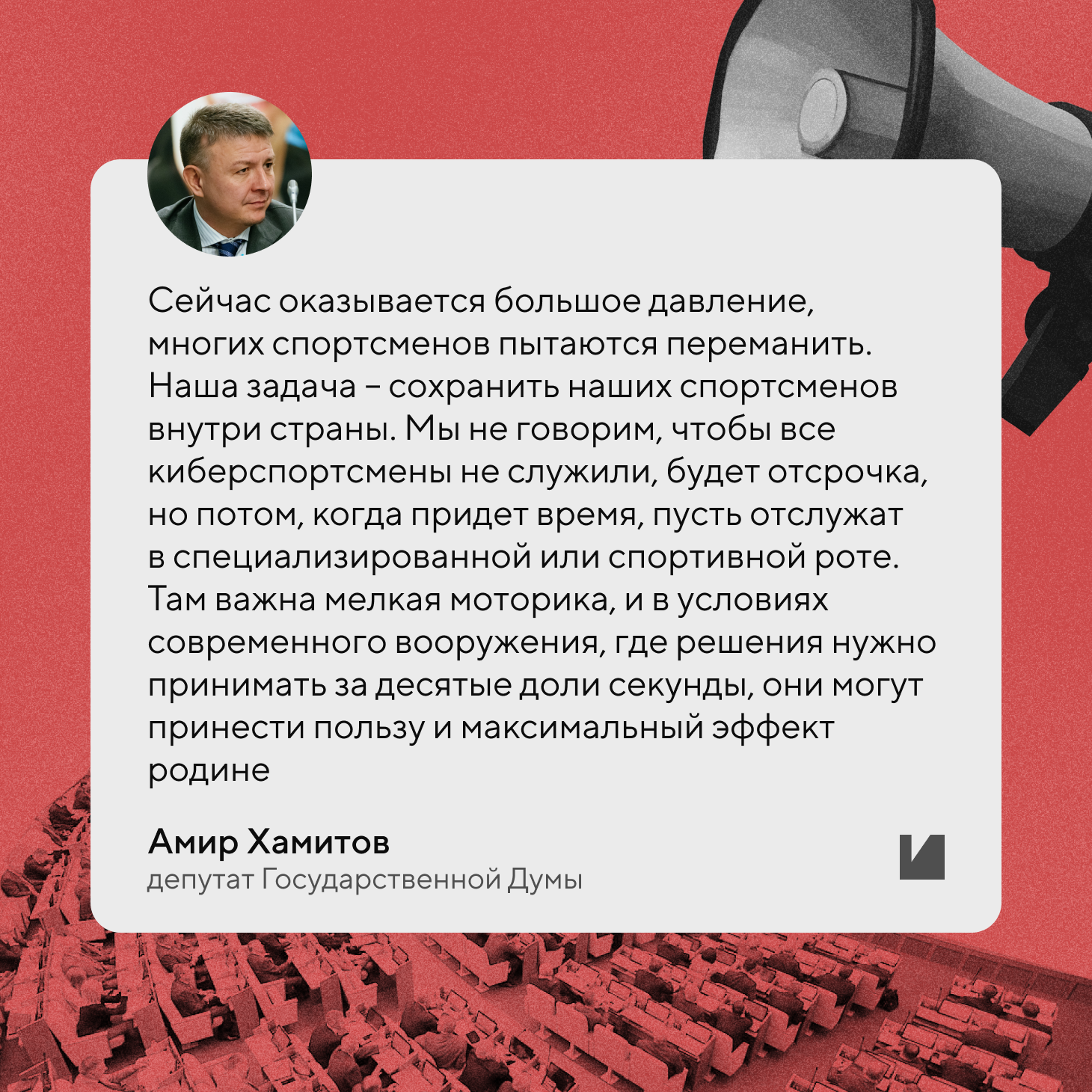 Например, касались армии. В апреле 2022 года депутат Хамитов предложил ввести для киберспортсменов отсрочку, после истечения которой их бы отправляли в особые роты.
