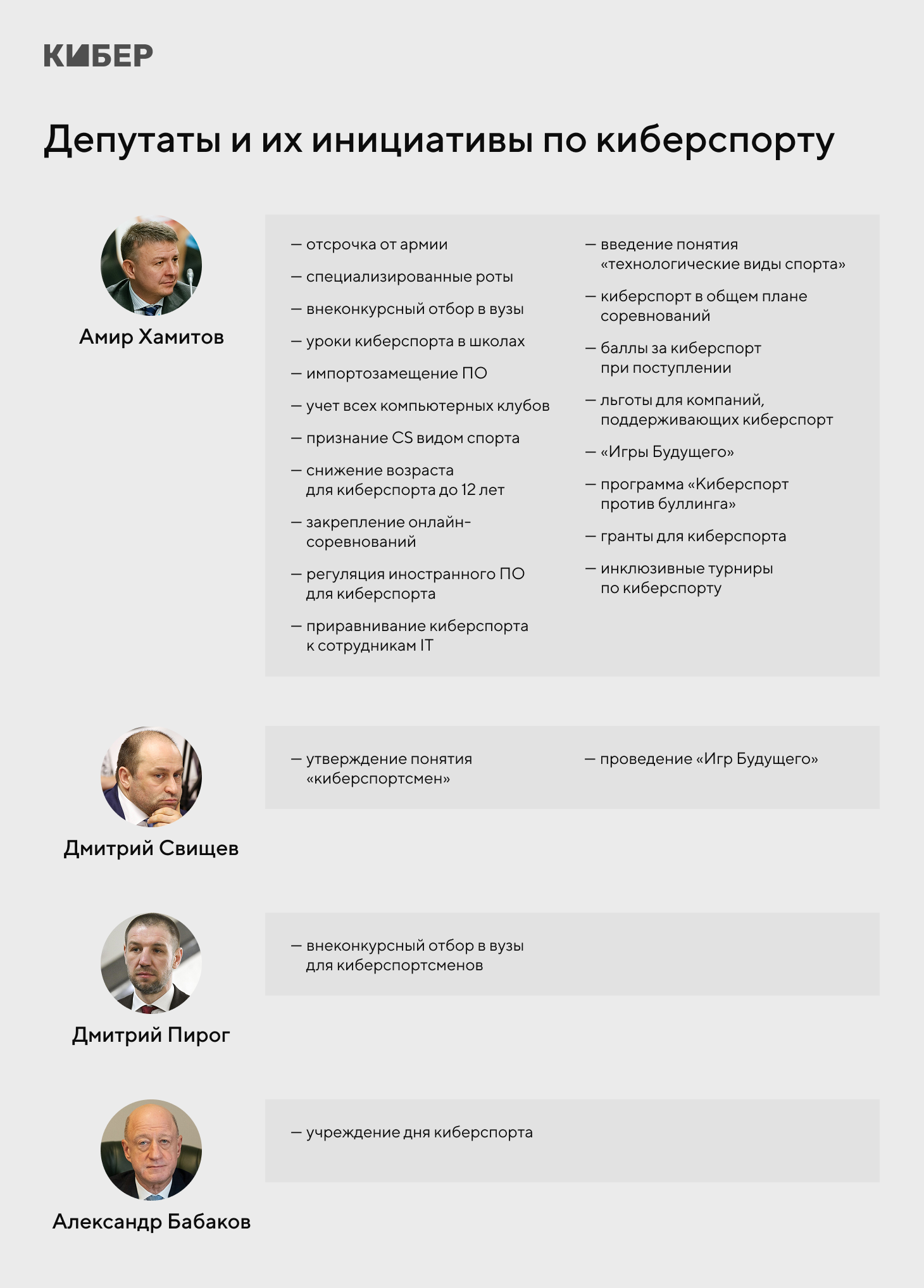 Хамитов и Свищев – самые заметные спикеры по киберспорту. Другие инициативы от депутатов: учреждение дня киберспорта или внеконкурсный отбор – единичные вбросы от чиновников Дмитрия Пирога и Александра Бабакова.