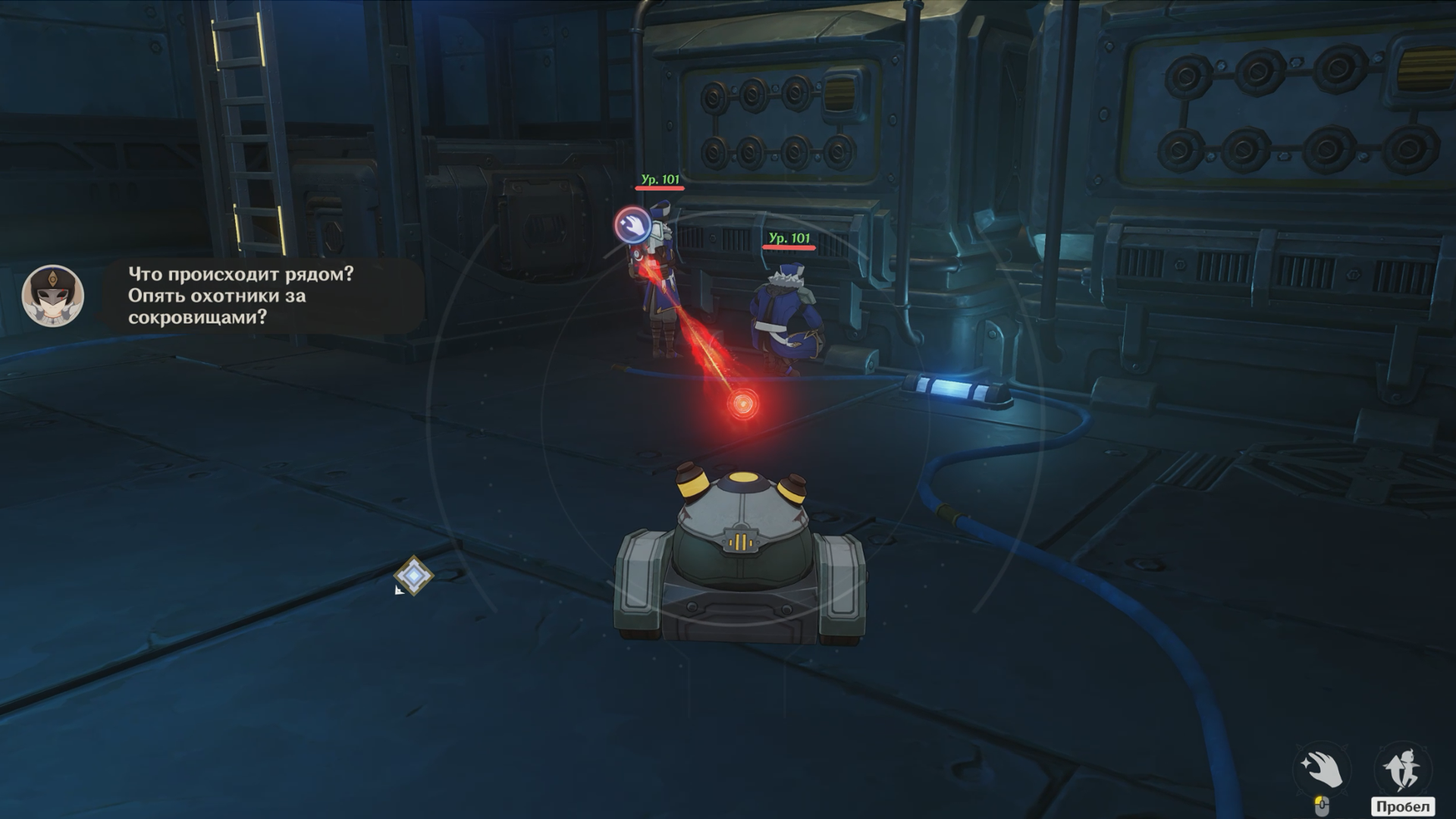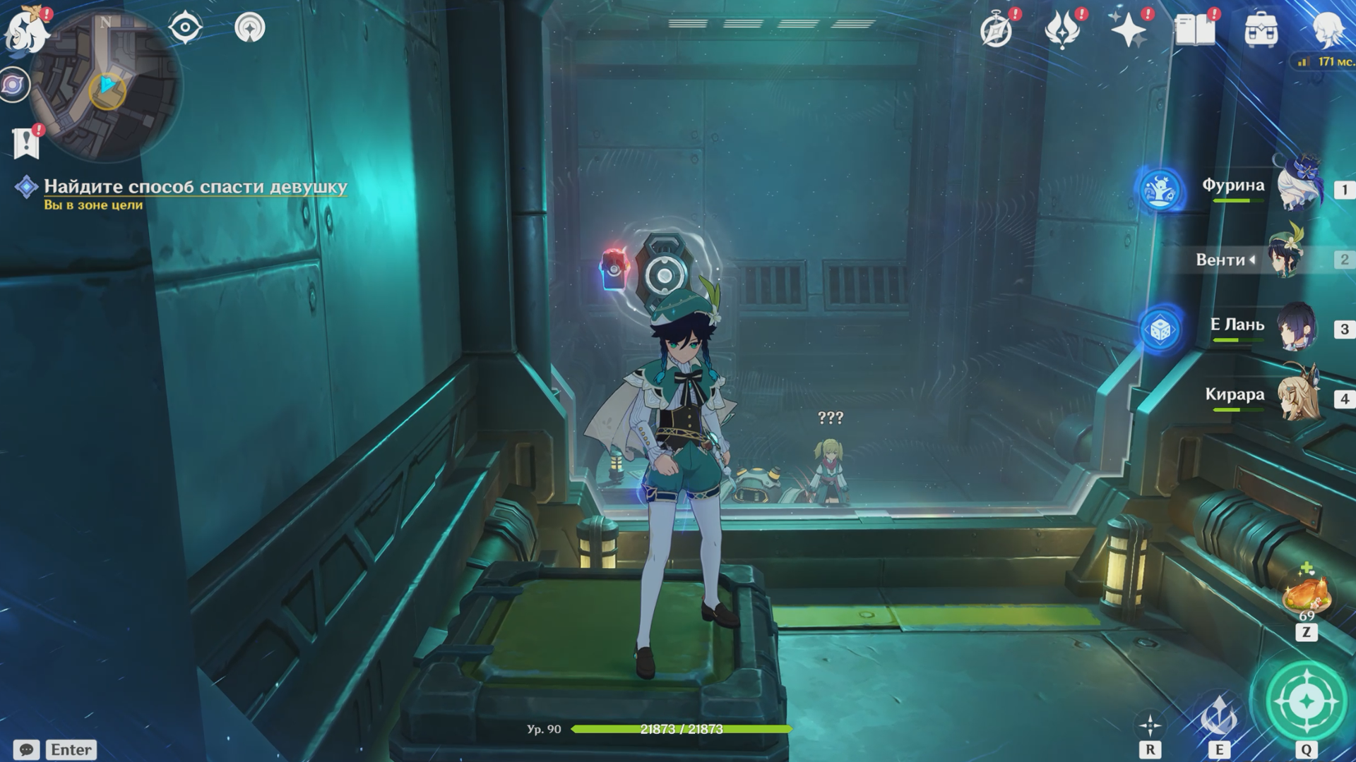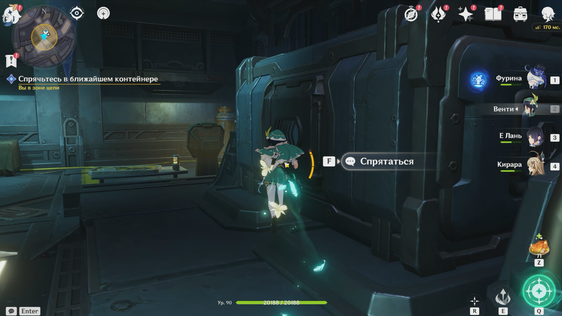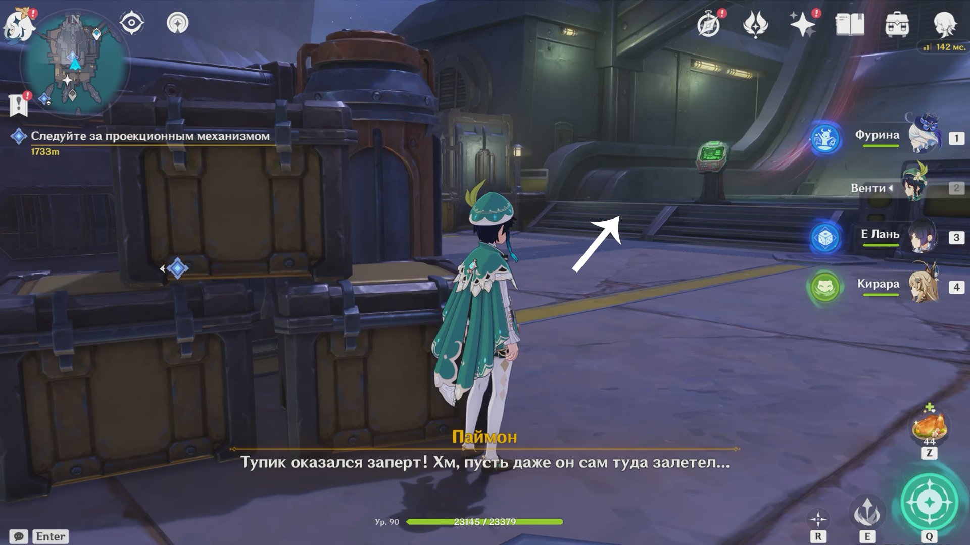 Наверху вы увидите двух работников Фатуи и девушку Азалию. После короткого диалога подойдите к терминалу и вызовите второй контейнер. Заберитесь внутрь, чтобы начать основную часть квеста.