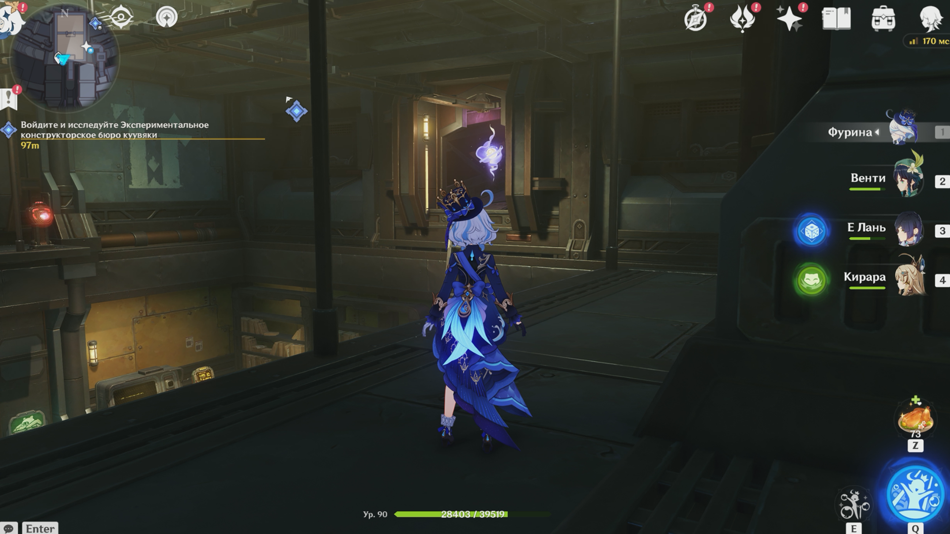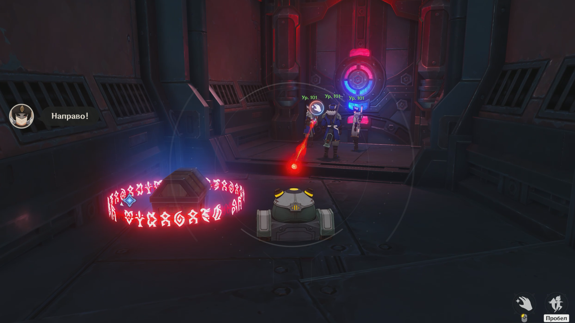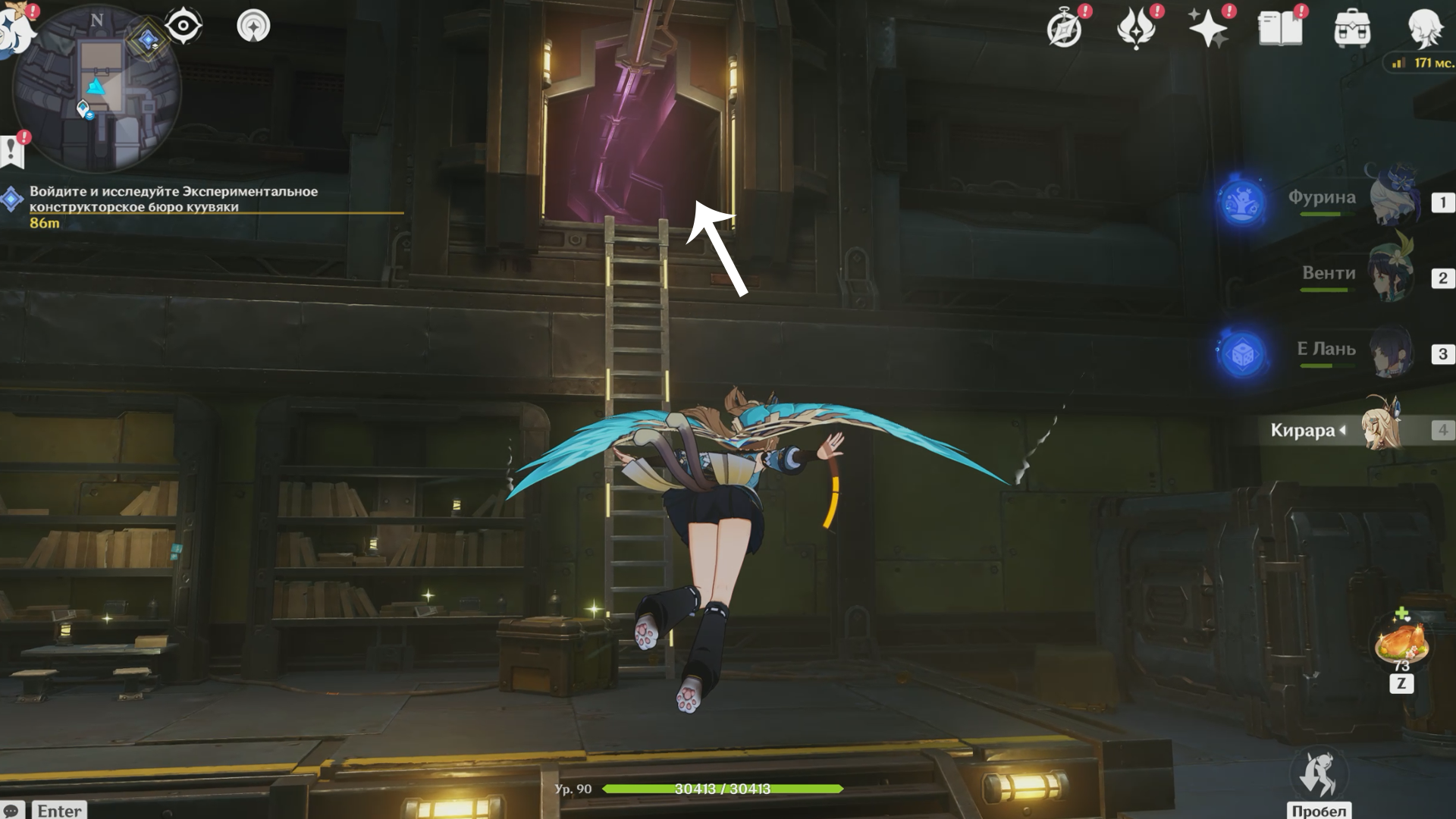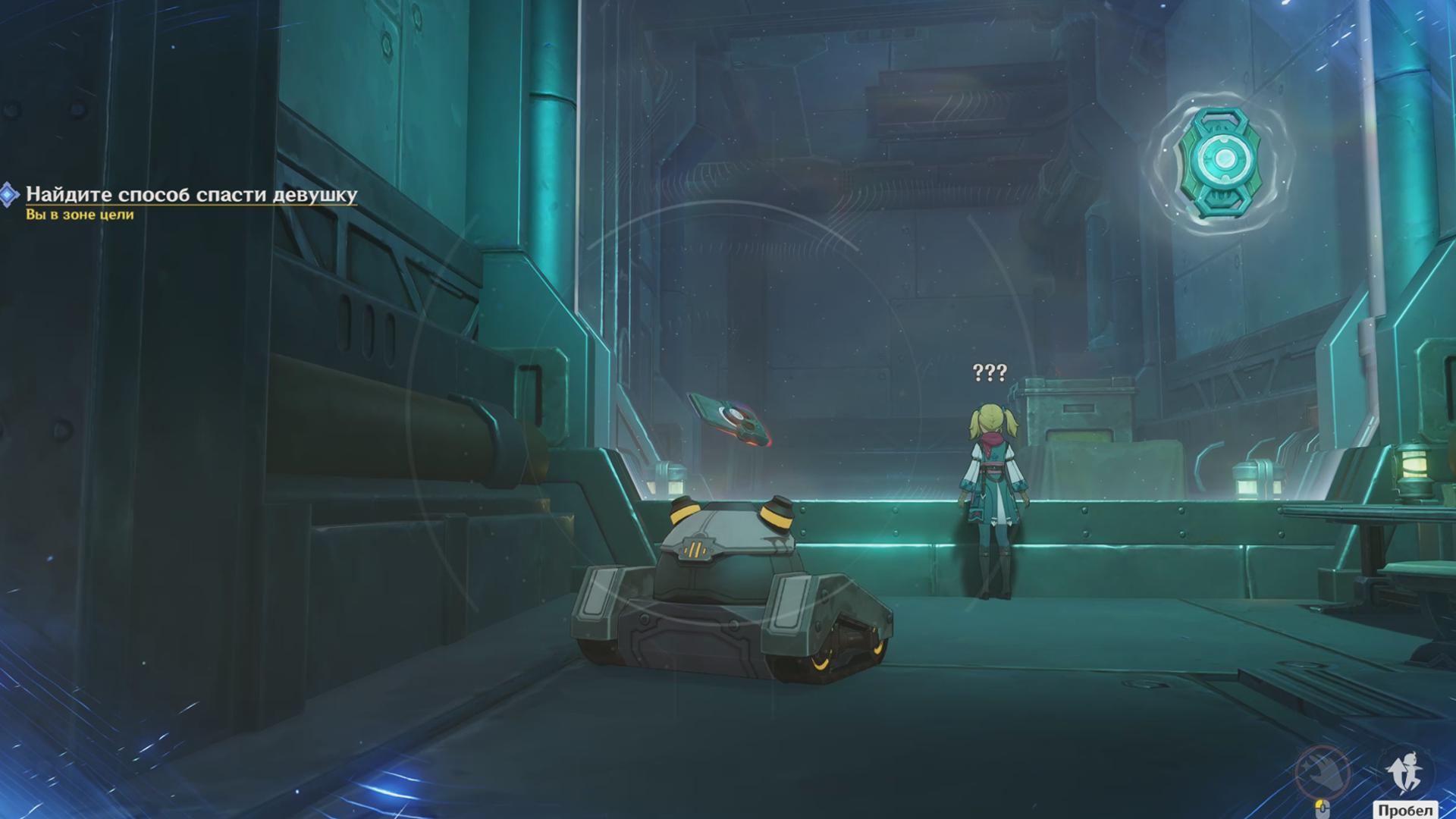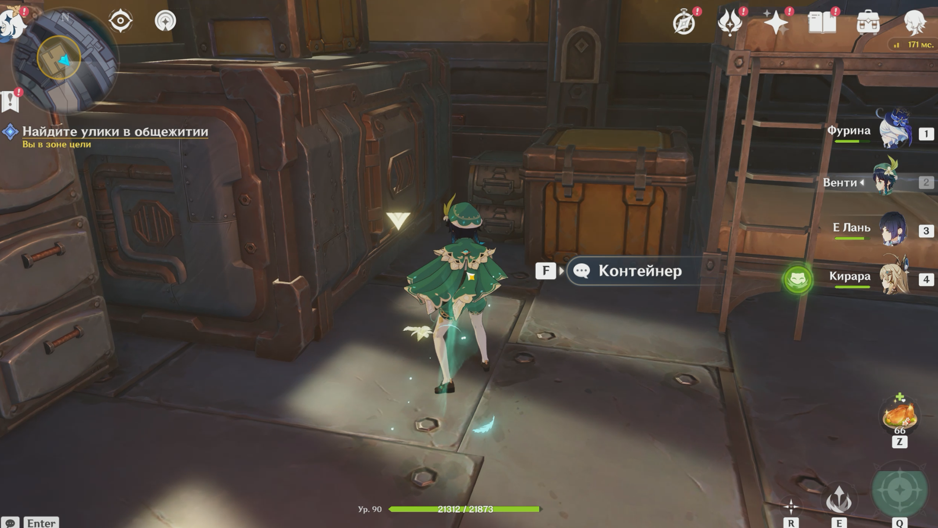 Наверху вы увидите двух работников Фатуи и девушку Азалию. После короткого диалога подойдите к терминалу и вызовите второй контейнер. Заберитесь внутрь, чтобы начать основную часть квеста.