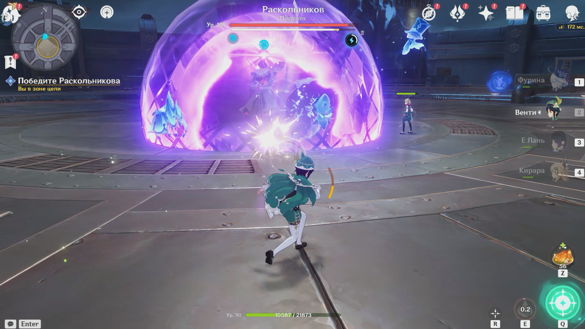 Поручик Раскольников использует длинные комбо и элементальные атаки. Кроме того, во второй фазе он кастует барьер появится барьер, который можно разрушить элементальными реакциями. Атакуйте его любыми сочетаниями стихий и уклоняйтесь от ударов сверху.